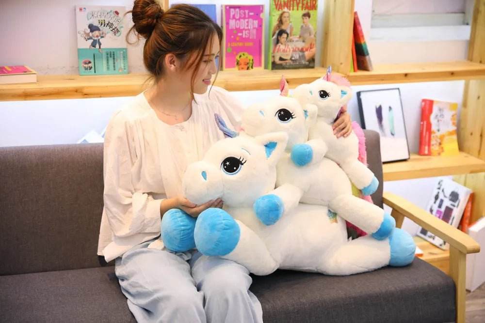 The images showcase the Unicorn Plush Toy in its full glory, highlighting its vibrant colors and adorable features. The plush unicorns are depicted in both Blue and Pink, with sizes ranging from a cozy 40cm to an impressive 80cm. Each unicorn is adorned with a rainbow mane and tail, adding to its enchanting appeal.