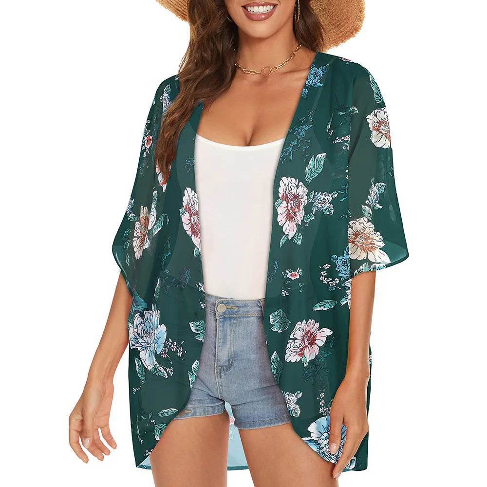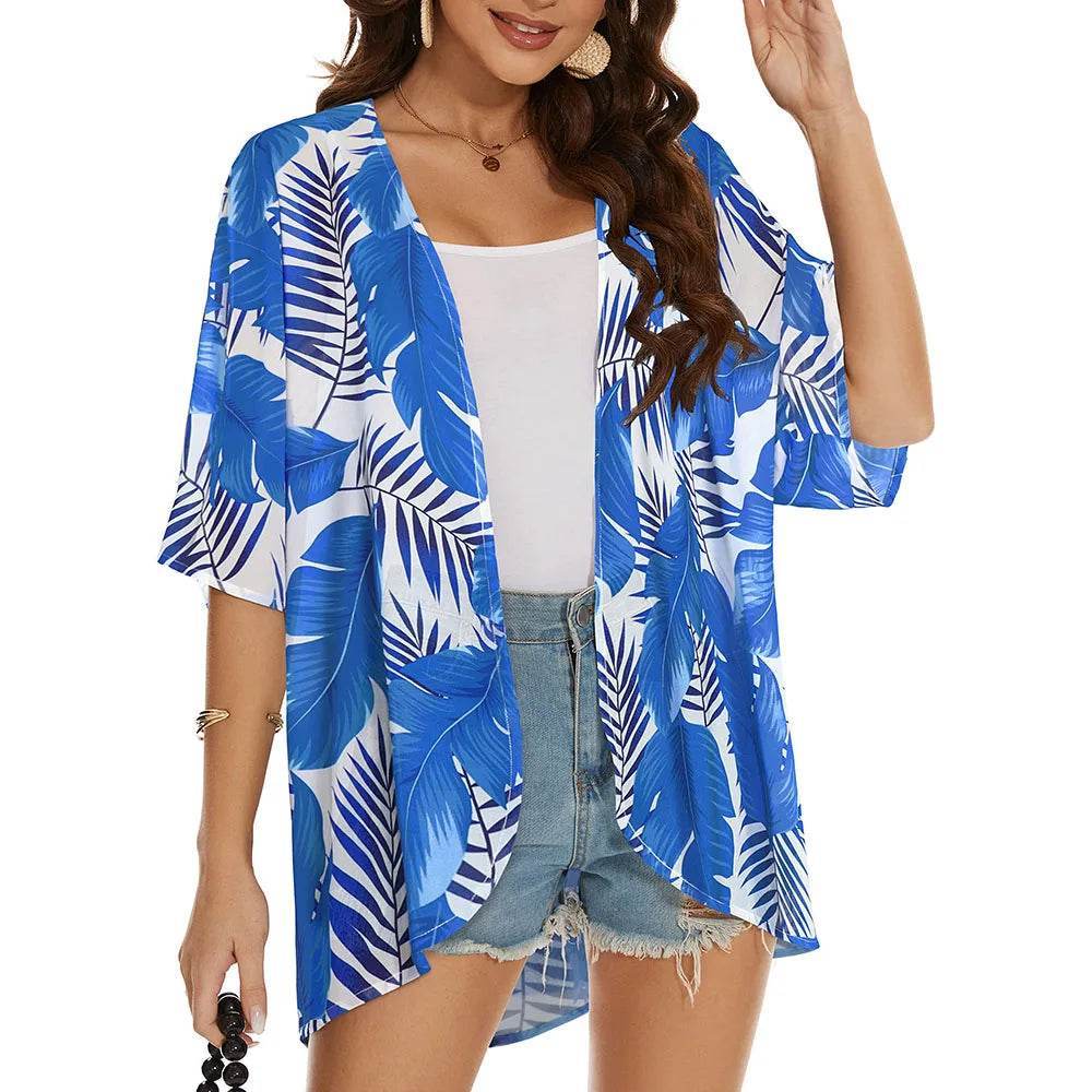 Embrace the summer vibes with the Women Blue Floral Swimwear Coverup Kimono from Mad Fly Essentials, and make every beach day a stylish one!