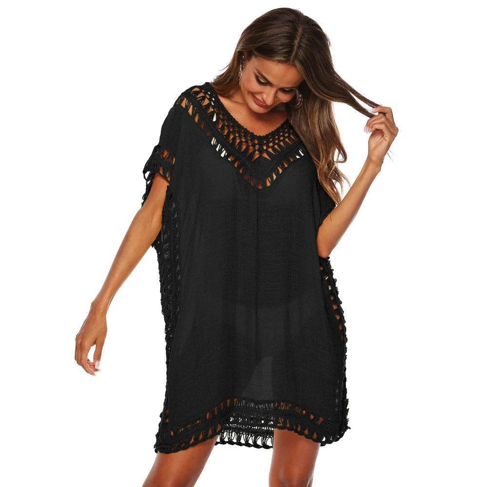 Available in a range of vibrant colors including pink, white, blue, red, beige, black, skyblue, purple, and yellow, this cover-up is designed to match any swimsuit. The airy, lightweight fabric drapes beautifully, making it an essential addition to your summer wardrobe. Whether you're taking a stroll on the beach or enjoying a seaside lunch, this cover-up transitions effortlessly from casual to chic.