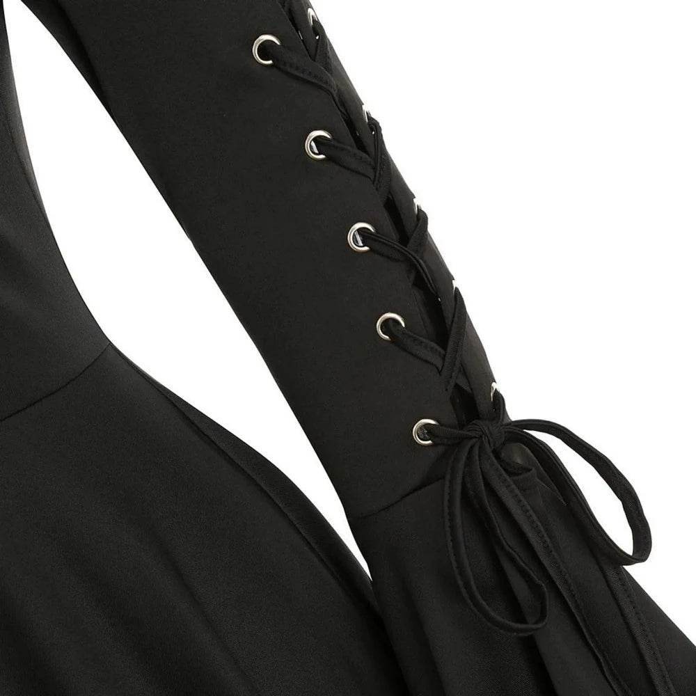 Crafted with attention to detail, the dress features lace-up sleeves that add a touch of sophistication and adjustability. The hooded design enhances the mysterious allure, making it a versatile piece for any occasion.