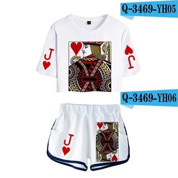The tracksuit features a striking Queen of Hearts design, with bold red and black accents that capture attention. The set includes a chic crop top and comfortable shorts, perfect for mixing and matching with other wardrobe favorites. Available in a range of colors like black, blue, pink, red, and white, you can choose the perfect hue to match your style.