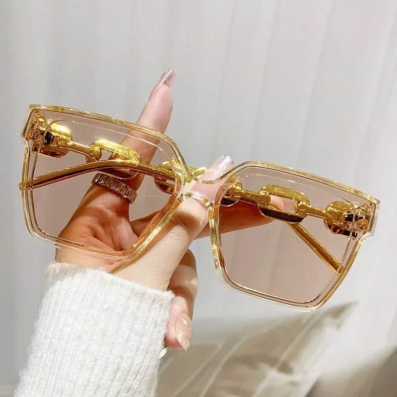 Featuring gold chain accents, these sunglasses add a touch of elegance and sophistication to any look. The images showcase the sleek black frames with gold details, highlighting their luxurious appeal. Perfect for those who appreciate a touch of glamour in their everyday accessories.