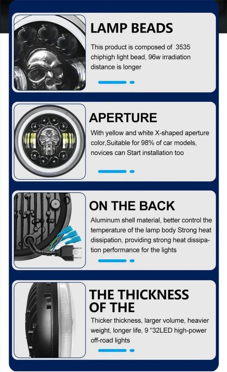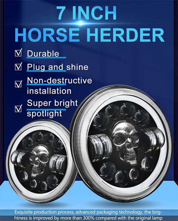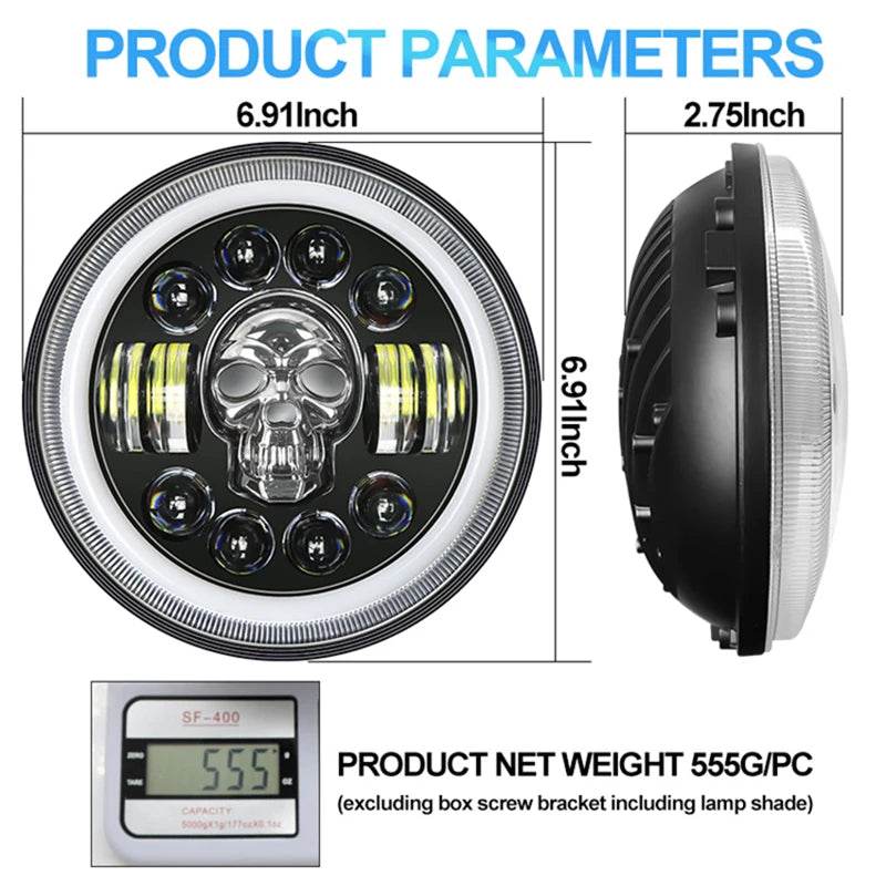 With its unique skull design and vibrant LED lights, this headlamp not only enhances your visibility but also adds a touch of personality to your motorcycle. Whether you're cruising through city streets or exploring open highways, the 7in LED Motorcycle Skull Auto Turn Headlamp ensures you do so in style.