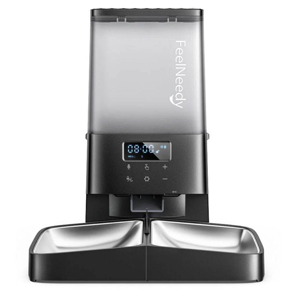 The images showcase a sleek, modern feeder with a clear container for easy monitoring of food levels. The digital display adds a touch of sophistication, allowing you to set precise feeding times. The dual feeding bowls accommodate multiple pets, making it a versatile addition to any pet-loving household.