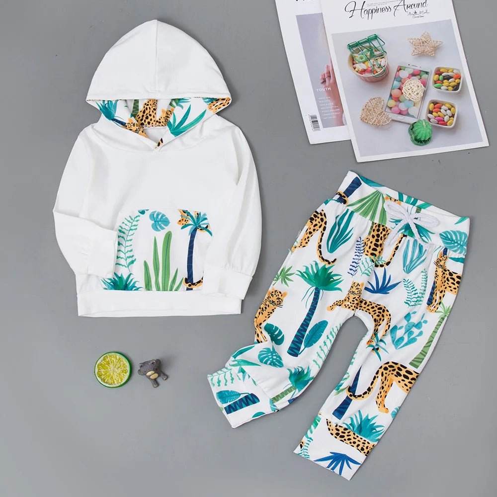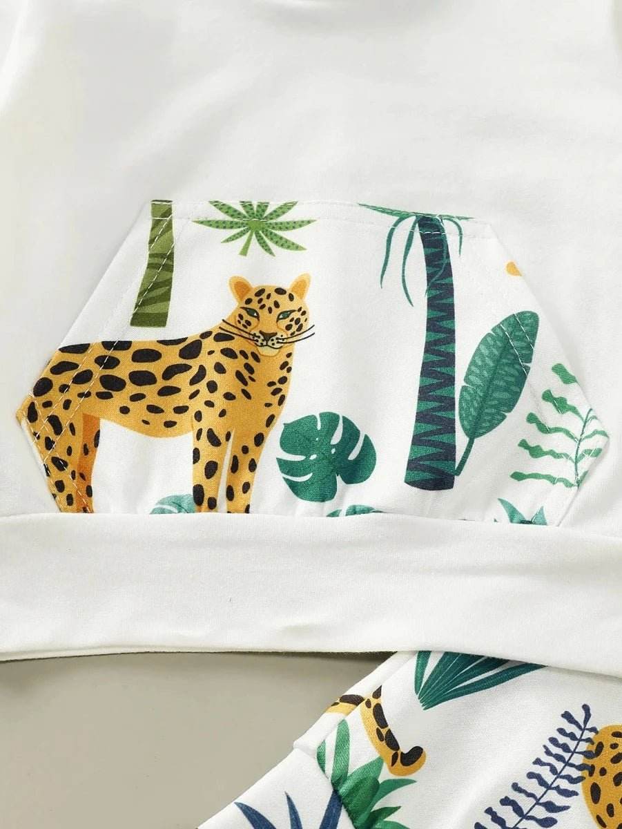 The set includes a long-sleeve top and matching pants, both adorned with vibrant leopard and tropical designs. Whether he's crawling around the house or taking his first steps outside, this outfit is designed to keep up with his every move. Available in sizes from 6-9 months to 3T, it's a versatile choice for growing toddlers.