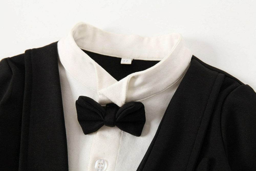 Our rompers feature a classic tuxedo design with a playful twist, combining black and white shades for a timeless look. Made from soft, high-quality fabrics, these rompers ensure your baby stays comfortable whether they're playing or napping. The long sleeves and easy snap closures make dressing and changing a breeze.