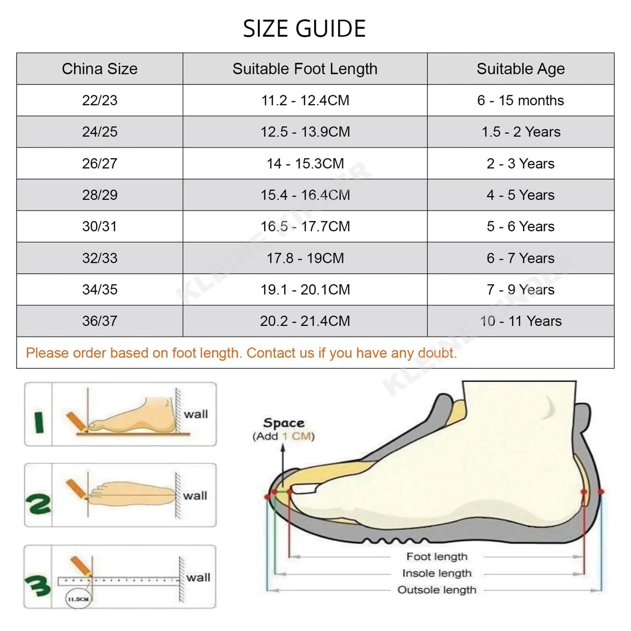 China Size Suitable Foot Length Suitable Age 22/23 11.2 - 12.4CM 6 - 15 months 24/25 12.5 - 13.5CM 1 - 2 years 26/27 13.6 - 14.6CM 2 - 3 years 28/29 14.5 - 15.4CM 3 - 5 years 30/31 16.5 - 17.7CM 5 - 7 years 32/33 17.8 - 19CM 7 - 9 years 34/35 19.1 - 20.1CM 9 - 10 years