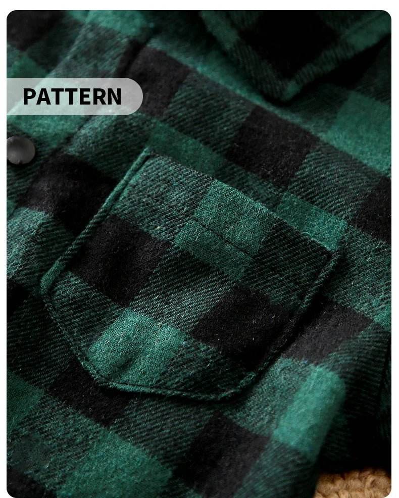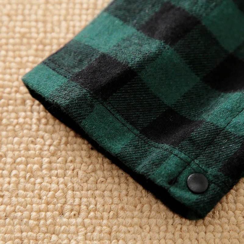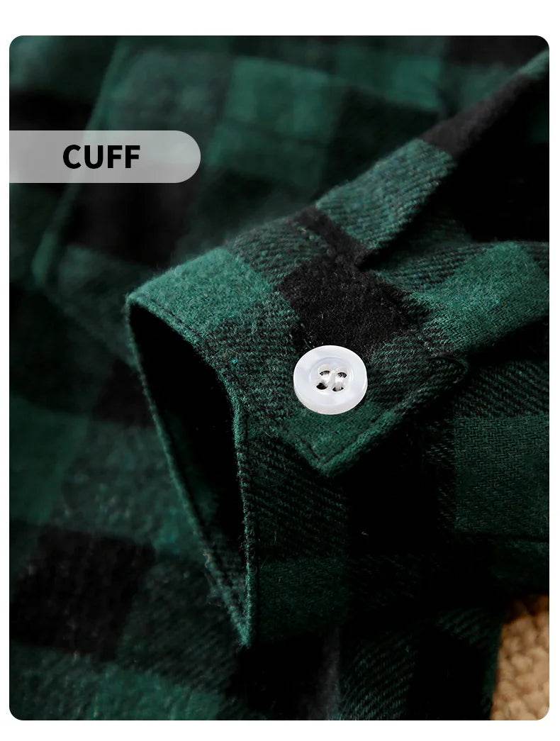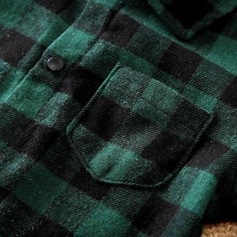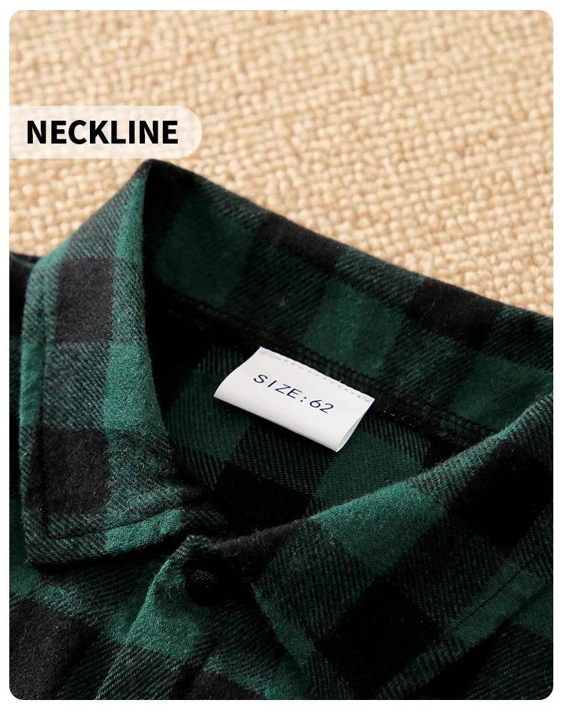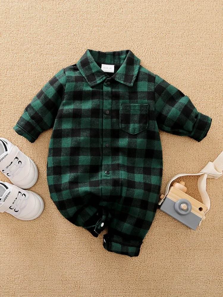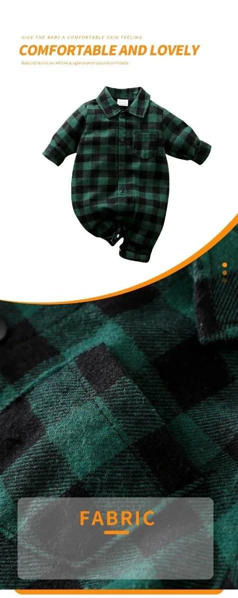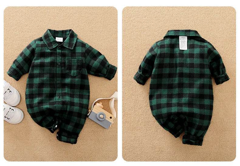 The images showcase the romper's rich green plaid design, highlighting its soft fabric and detailed craftsmanship. The buttoned cuffs and pocket add a touch of elegance, making it a must-have in your baby’s wardrobe.