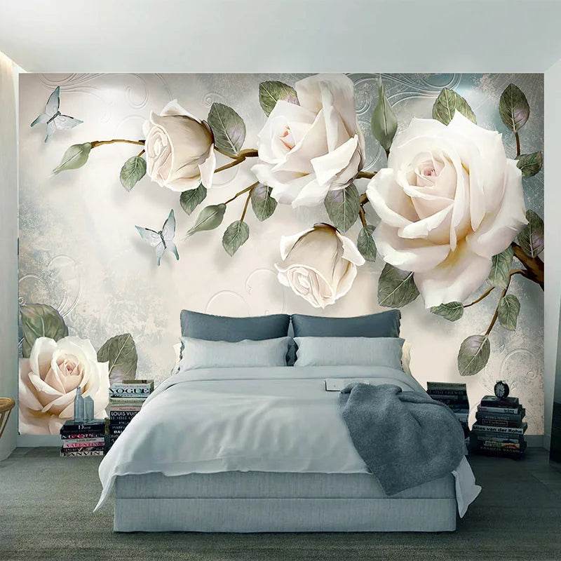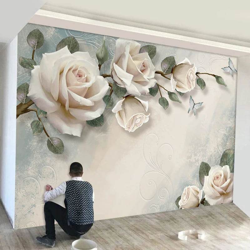 The images showcase the wallpaper's breathtaking design, featuring large, lifelike roses that seem to bloom right off the wall. The soft color palette and intricate details create a serene and inviting atmosphere, perfect for relaxation and enjoyment.