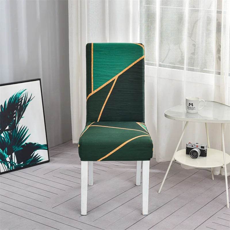 The images showcase the slipcovers in a beautifully lit dining room, highlighting their ability to transform any space. The geometric patterns and floral designs add a modern touch, making your dining area inviting and chic.