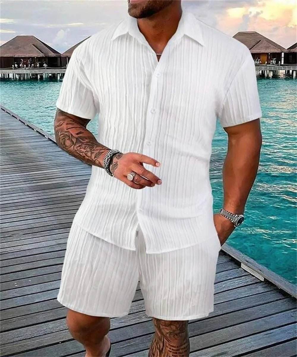 The images showcase the sleek design and vibrant colors of the sets, highlighting their modern and stylish appearance. The matching tops and shorts create a cohesive look that is both fashionable and functional, perfect for any active man looking to elevate his wardrobe.