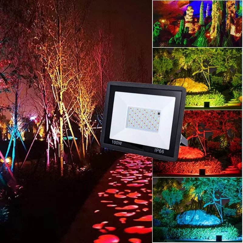 Imagine your garden bathed in a wash of vibrant colors, or your patio illuminated with a soft, ambient glow. The images showcase the floodlight's ability to create stunning visual effects, making it a must-have for any outdoor enthusiast.