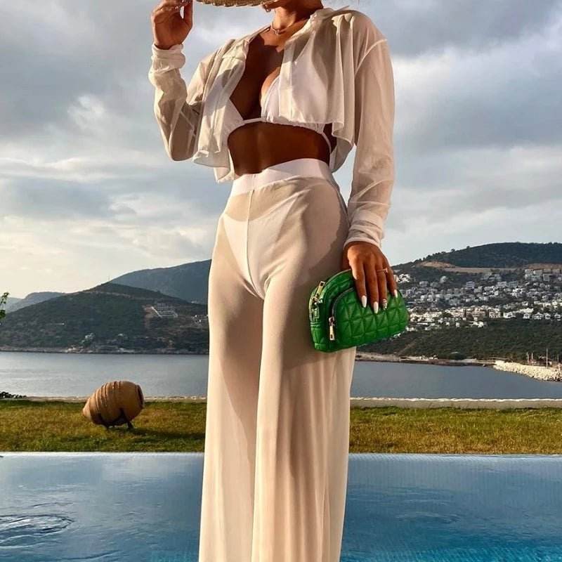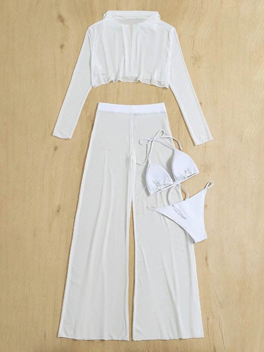 This 4-piece set includes a halter triangle bikini top and matching bottoms, complemented by a stylish cover-up. Available in a range of colors like black, blue, pink, red, and classic white, you can choose the perfect shade to match your summer vibe. The lightweight fabric and spaghetti straps add a touch of bohemian flair, perfect for those who love a carefree, beach-ready look.