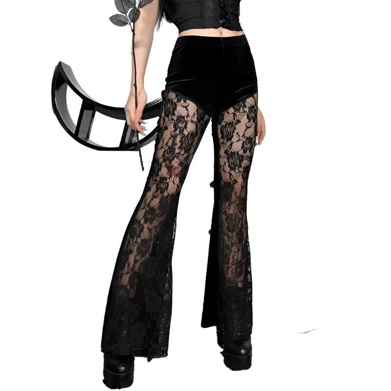 The images showcase the pants' stunning lace pattern and flattering fit. The flared legs add a touch of drama, making them perfect for pairing with your favorite tops and accessories. The gothic aesthetic is enhanced by the rich black color, ensuring you stand out in any crowd.