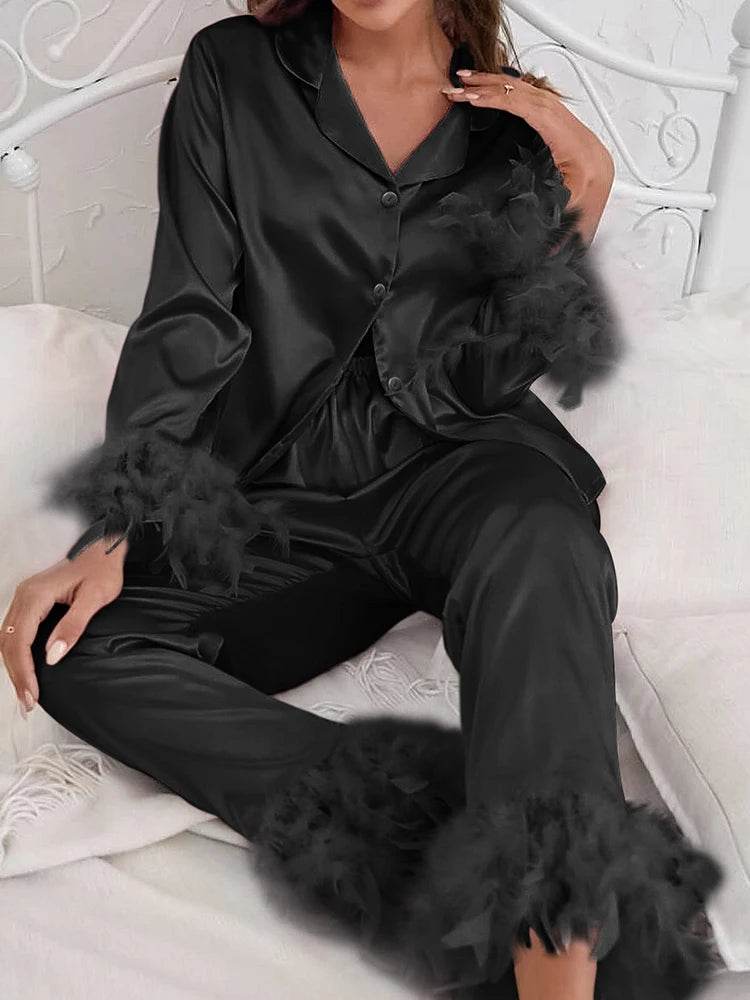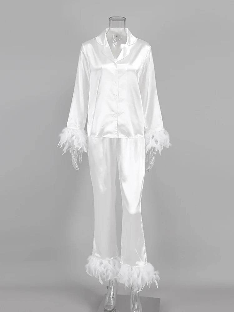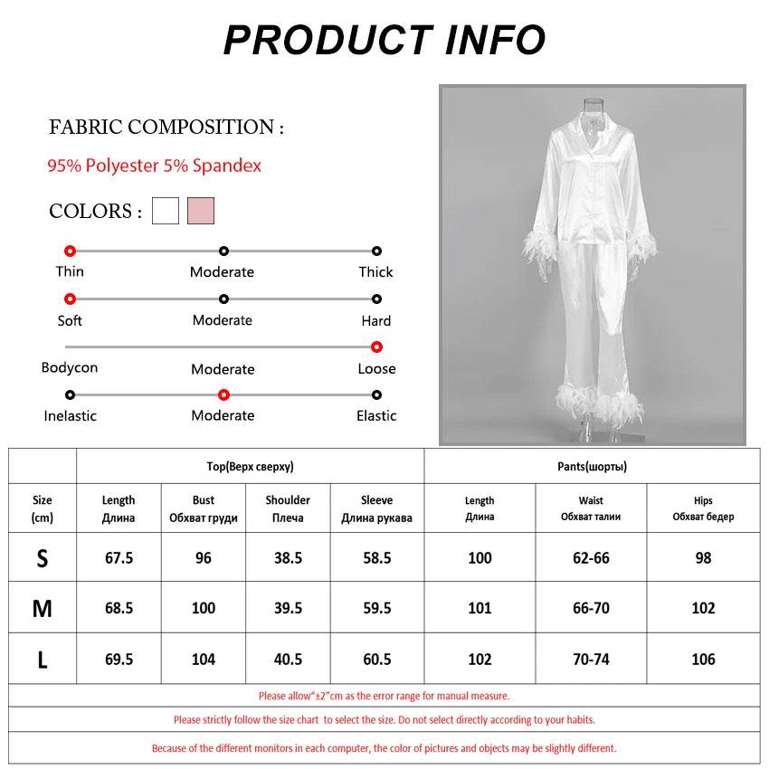 Embrace the perfect blend of comfort and elegance with our Women Feather Long 2pc Pajama Sleepwear Set from mnealways18. This chic ensemble features a luxurious satin and spandex blend, ensuring a soft and breathable feel against your skin. The loose fit, combined with a turn-down collar and elastic waist, offers ultimate relaxation for lounging at home.