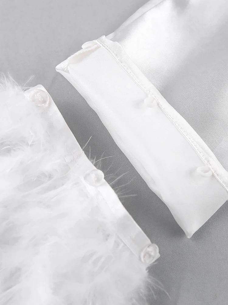 • Design: Feathered accents on the sleeves for a touch of glamour