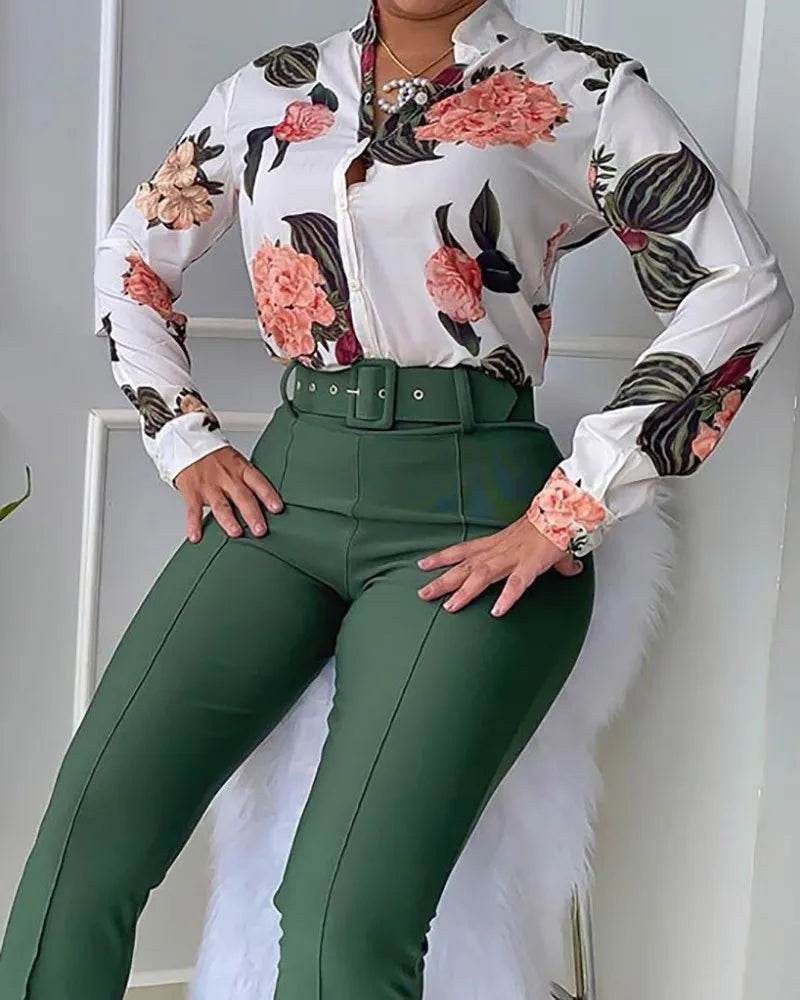 The images showcase the set's elegant design, highlighting the intricate patterns and flattering fit. The long top features a stylish collar and button-down front, while the pants offer a tailored silhouette that enhances your figure. Whether you choose the bold green or classic black, you're sure to make a statement.