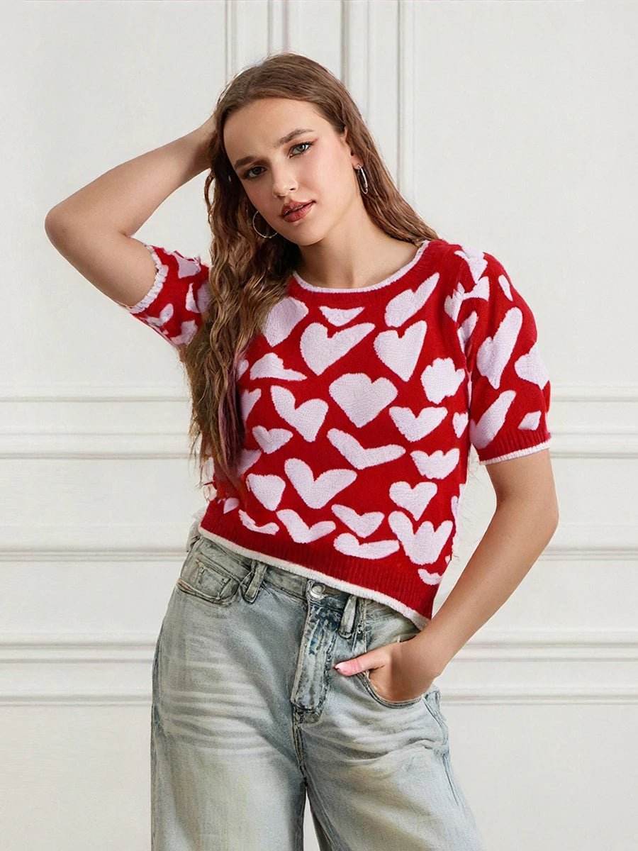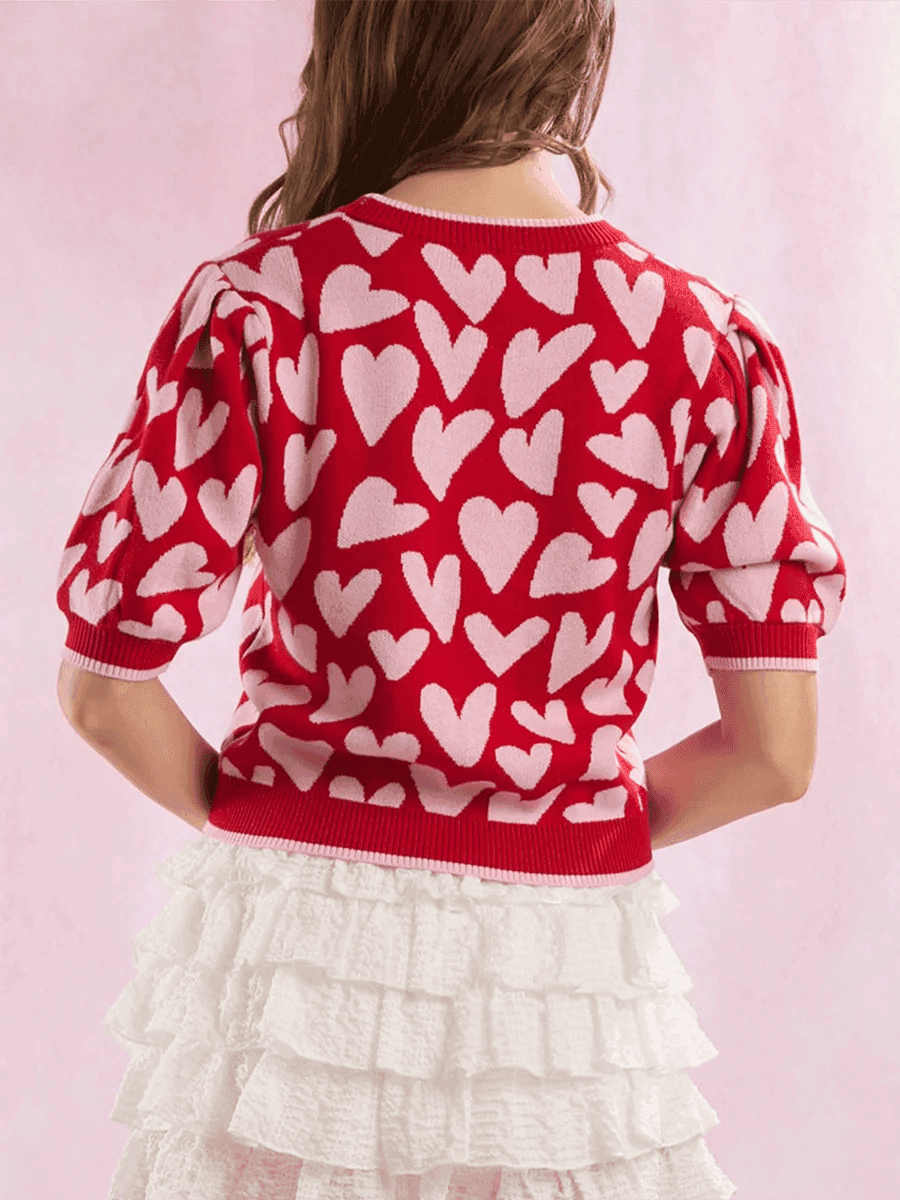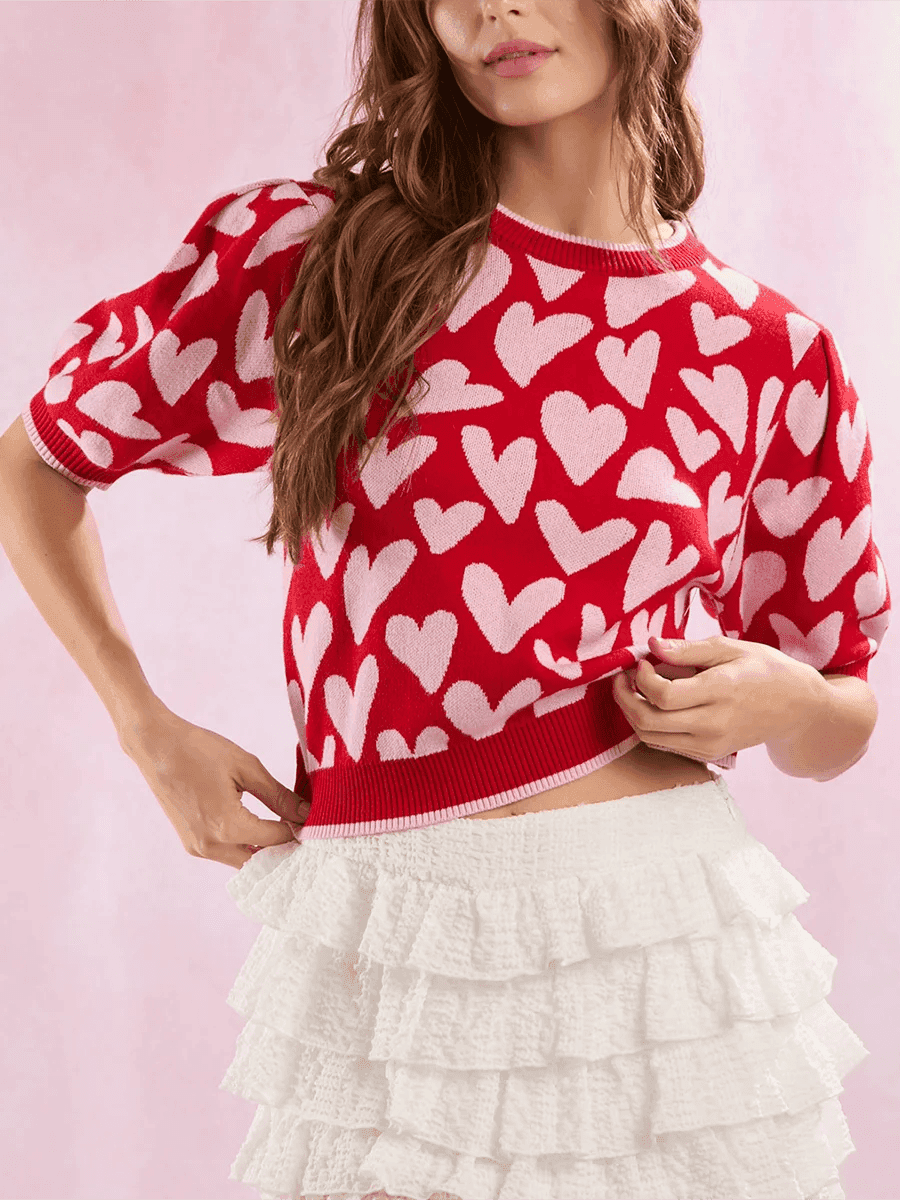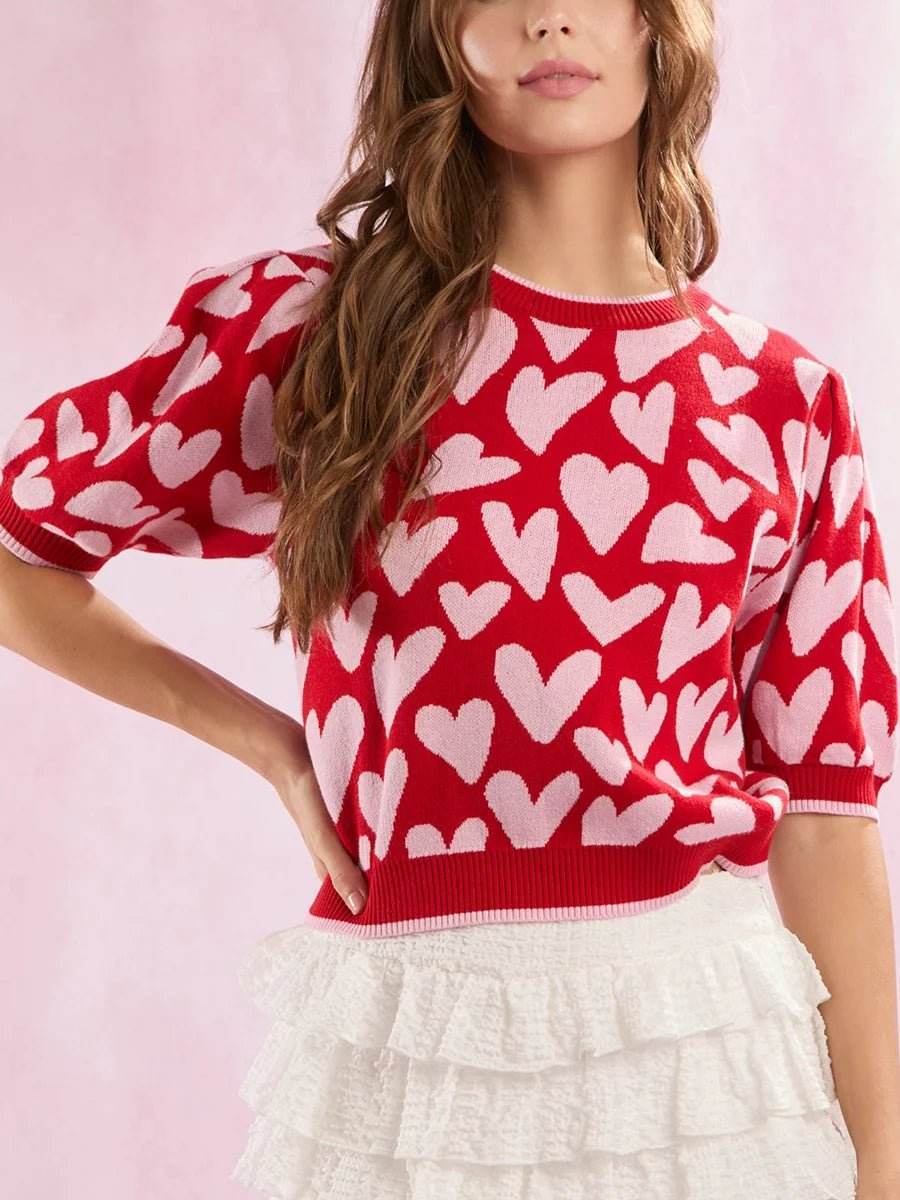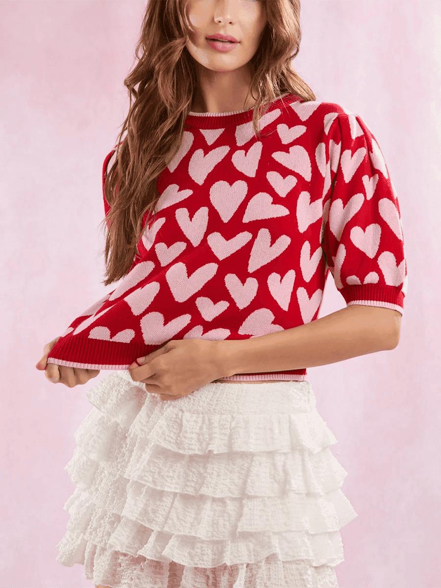 The sweater's vibrant red color, adorned with playful pink hearts, makes it a standout piece. Its design is both eye-catching and endearing, perfect for those who love to make a statement with their fashion choices. The images showcase the sweater paired with a stylish ruffled skirt, highlighting its versatility and charm.