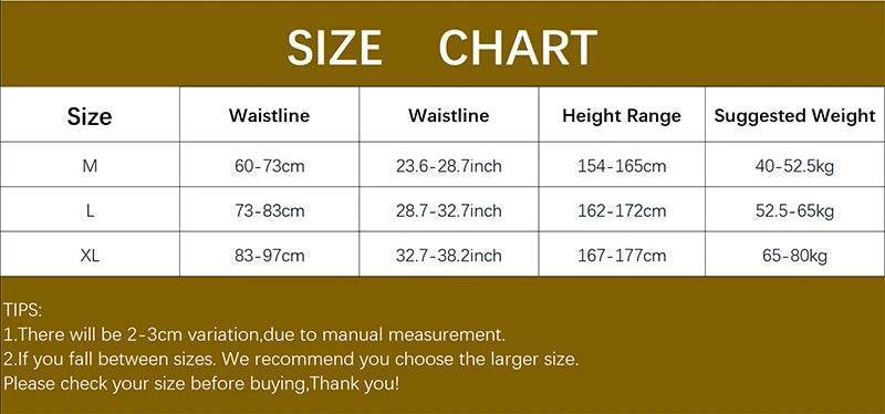 Size Waistline (cm) Waistline (inch) Height Range (cm) Suggested Weight (kg) M 60-73 23.6-28.7 154-165 40-52.5 L 73-83 28.7-32.7 162-172 52.5-65 XL 83-97 32.7-38.2 167-177 65-80