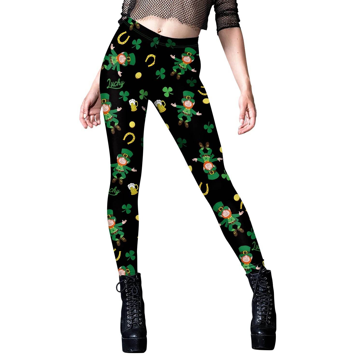 The leggings showcase a vibrant shamrock pattern against a sleek background, making them a standout piece in any wardrobe. Pair them with your favorite top and boots for a chic look that’s sure to turn heads.