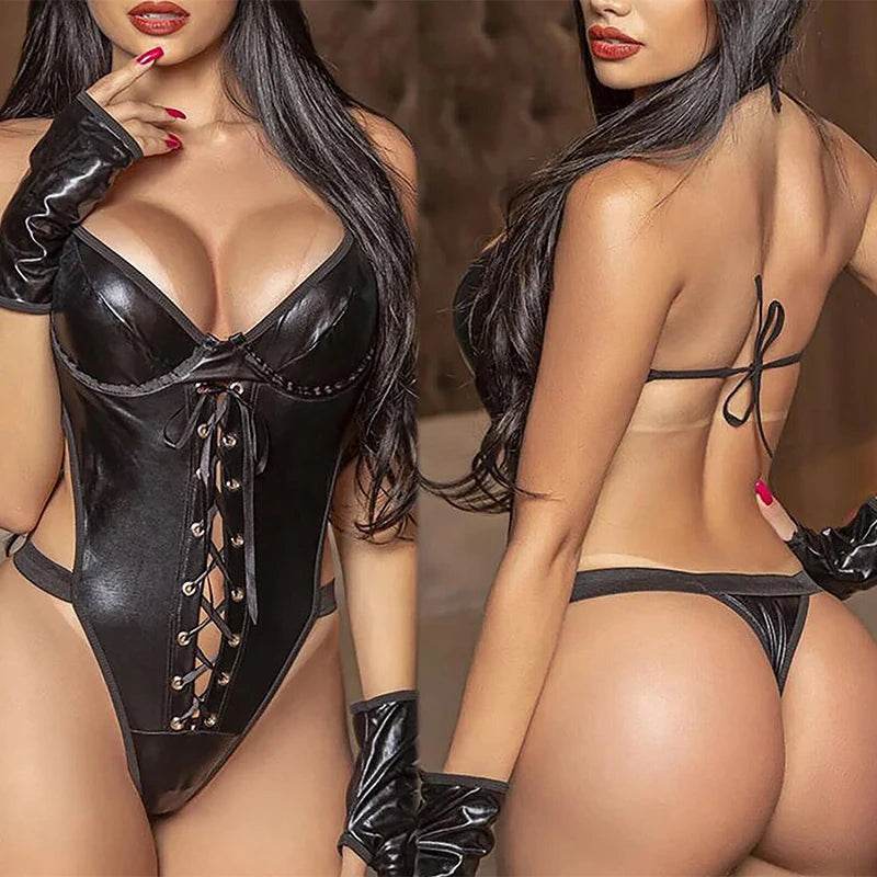Embrace your unique style and make a lasting impression with this stunning Women Leather V-Neck Bodysuit Cosplay Lingerie Set. It's more than just a costume; it's a statement of confidence and individuality.