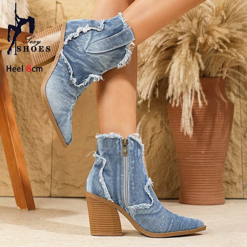These boots feature a striking design with frayed denim accents and an 8cm heel, offering a bold statement that stands out. Available in classic colors, they provide a perfect blend of retro and modern styles, making them a must-have in any wardrobe.