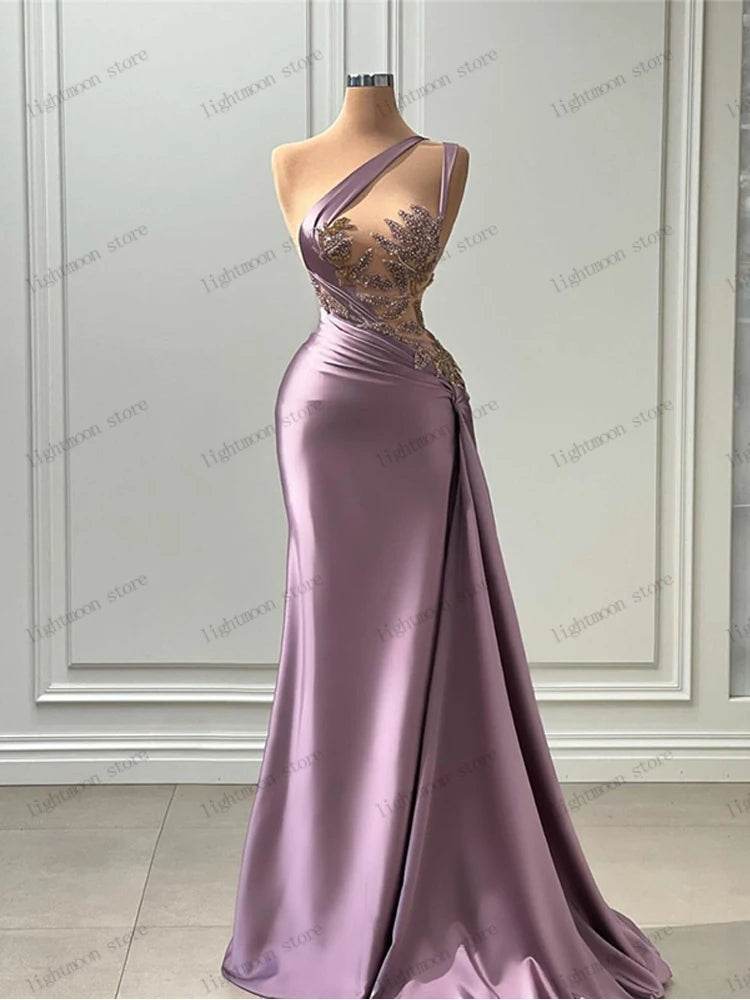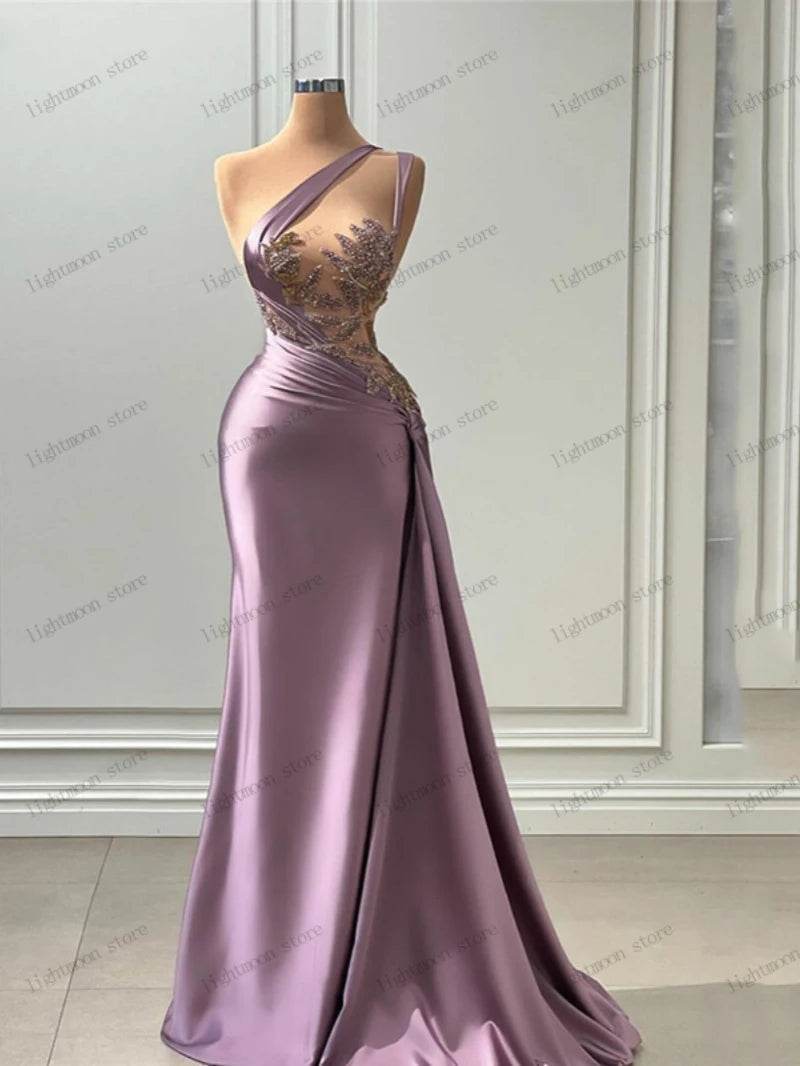 The images showcase the dress's elegant drape and intricate detailing, highlighting its luxurious satin finish. The dress's design includes a graceful one-shoulder strap and delicate embellishments that add a touch of glamour. Whether you're dancing the night away or posing for photos, this dress ensures you look and feel your best.