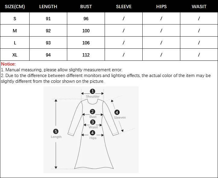 Size Length (cm) Bust (cm) S 91 96 M 92 100 L 93 106 XL 94 112