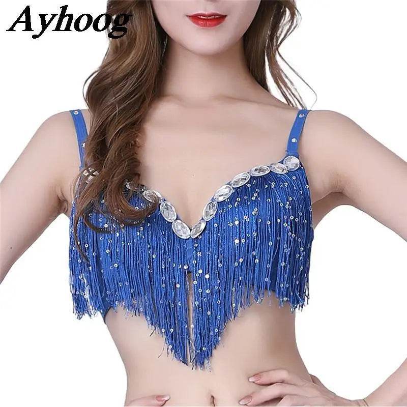 Stand out in style with Ayhoog's stunning Belly Dance Costume Sequin Bras! Perfect for European and American-inspired performances, these tassel bras are sure to captivate any audience with their shimmering sequins and fringe details.