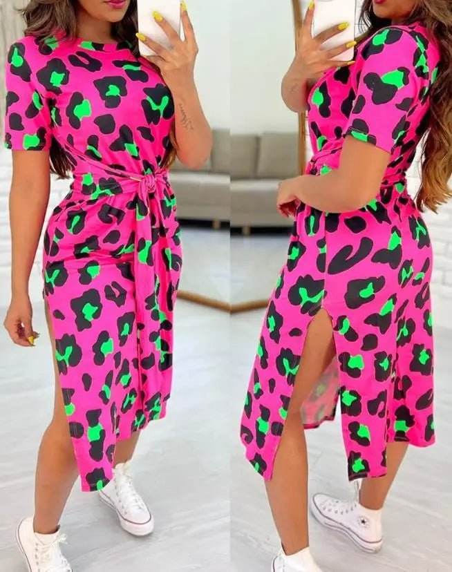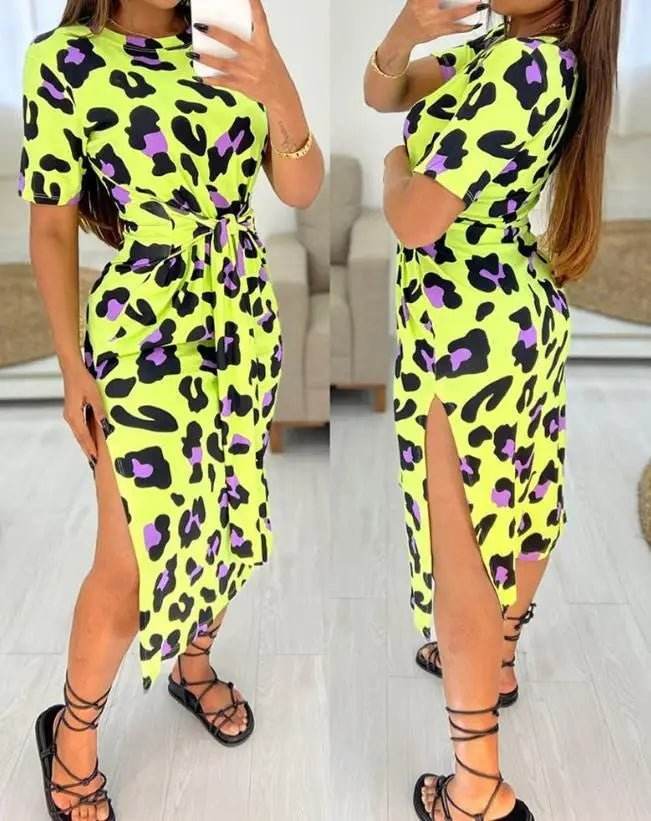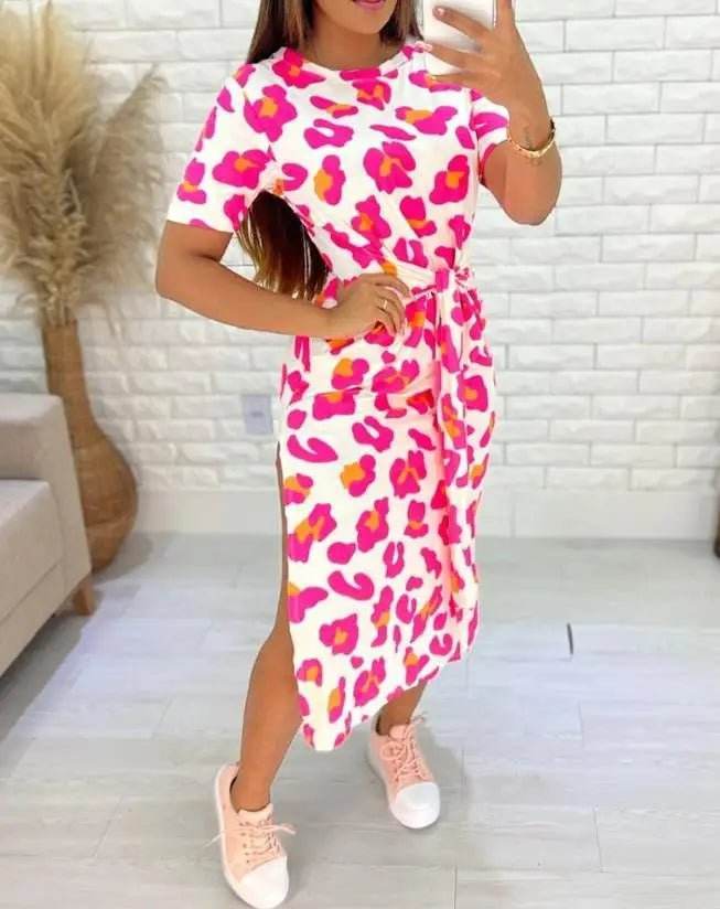 The dress features a flattering silhouette with a tie waist, enhancing your natural shape. The playful patterns and side slits add a modern twist to the vintage look, making it a must-have for your summer wardrobe.
