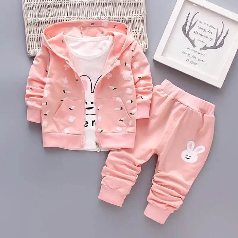 The images showcase the vibrant pink tracksuit with its playful bunny and floral motifs. The set includes a zip-up hoodie, a cute t-shirt, and matching pants, all designed to keep your baby snug and stylish.
