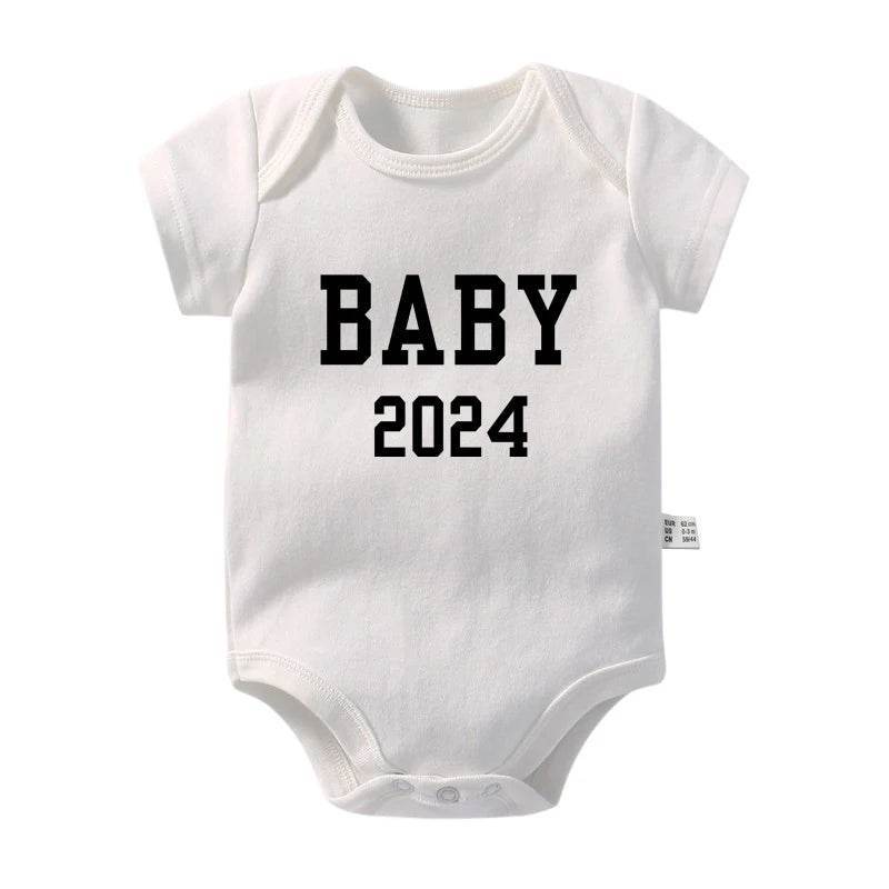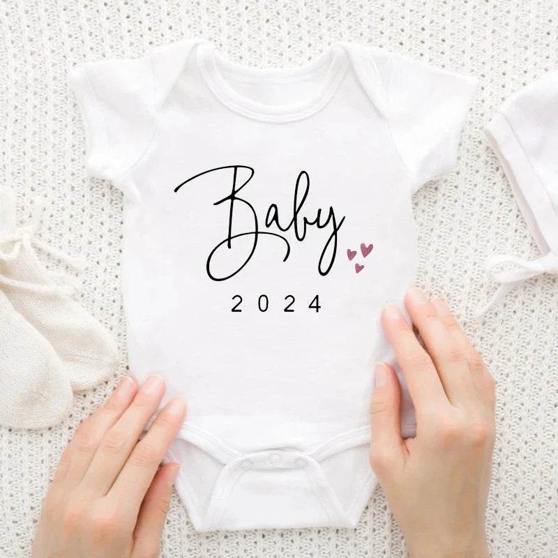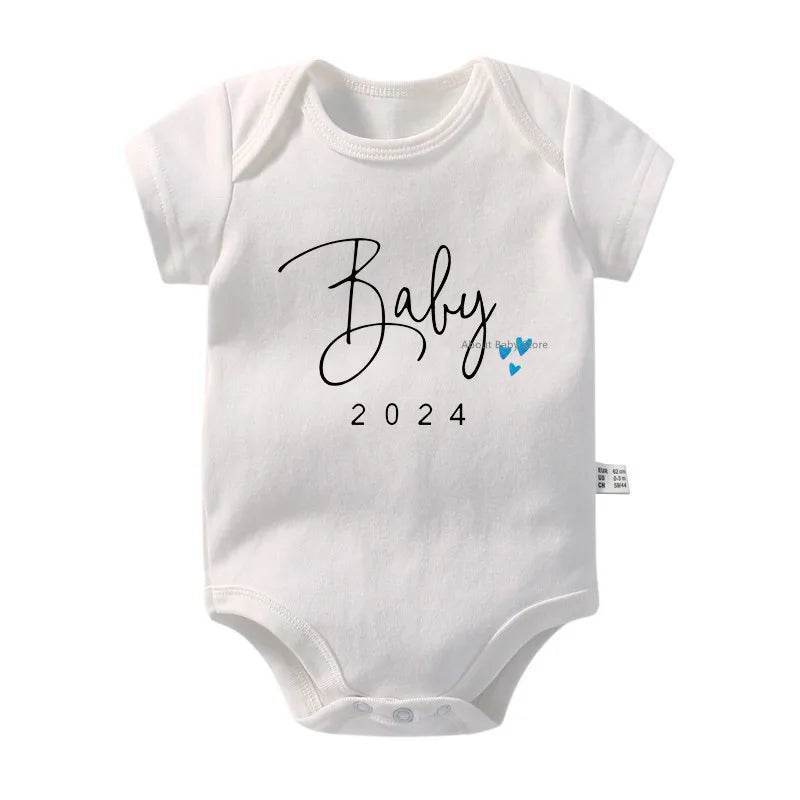 Introducing the Announcement 2024 Boy Girl Baby Romper, perfect for sharing the exciting news of your upcoming bundle of joy. Designed for babies aged 0-24 months, these unisex rompers feature a trendy O-neck collar and adorable letter patterns that make a statement at baby showers or announcements.