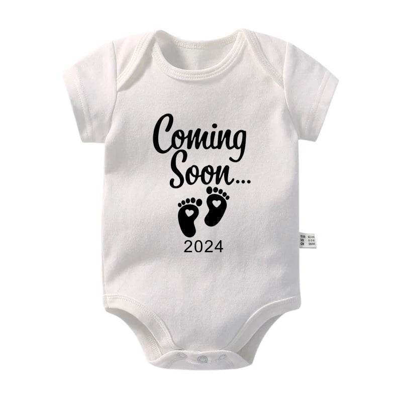 Crafted from soft, breathable fabric, these rompers ensure your baby stays comfortable while looking stylish. The charming designs, including "Coming Soon" and "Baby 2024," add a touch of cuteness to your announcement photos. Available in a variety of colors, you can choose the perfect shade to match your theme.