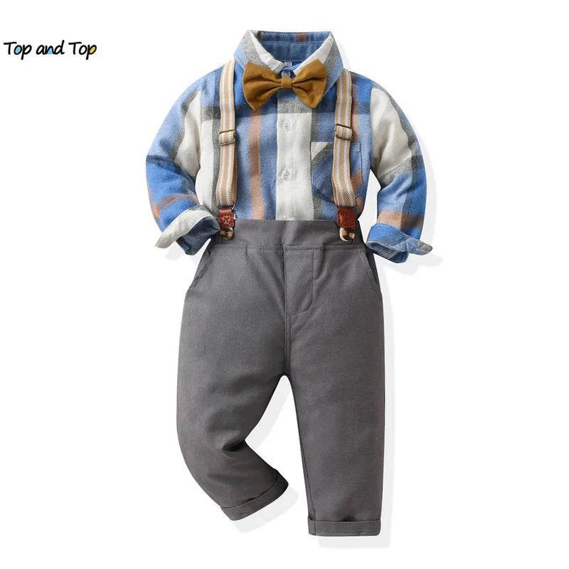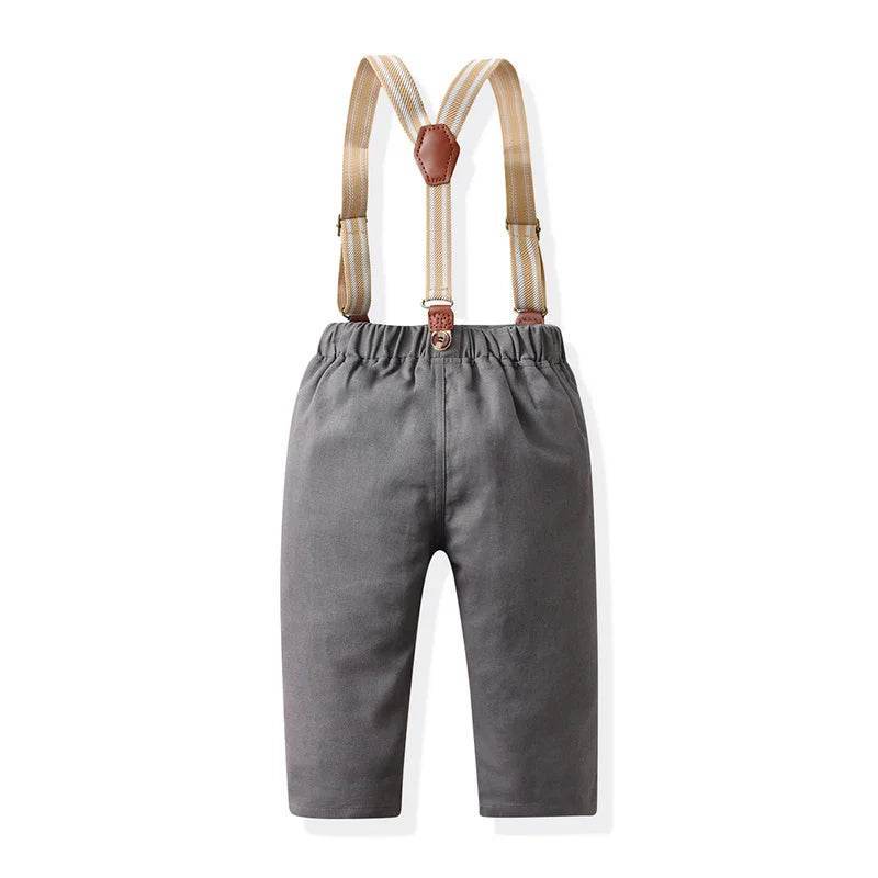 The set includes a charming plaid shirt paired with sophisticated grey pants, complete with adjustable suspenders and a cute bow tie. The soft fabric ensures your child stays comfortable, whether they're attending a family gathering or playing at a birthday party.