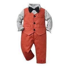 Designed with high-quality, gentle materials, this outfit includes a stylish striped shirt, a smart bow tie, and a sophisticated vest, all paired with comfortable pants. The ensemble is available in delightful color combinations like brown and watermelon red, catering to your taste and the occasion.
