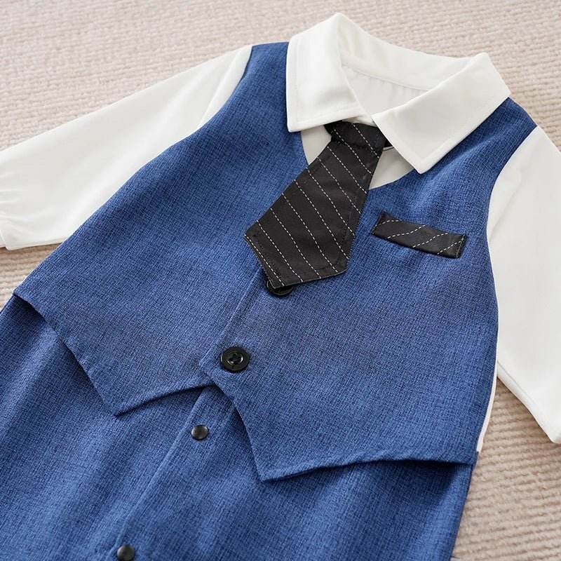 The romper features a classic navy blue color, giving it a sophisticated look. The design includes a smart vest, a crisp white shirt, and a charming tie, all in one piece, making it easy to dress your baby. The soft fabric is gentle on your baby's skin, ensuring they stay comfortable throughout the event.