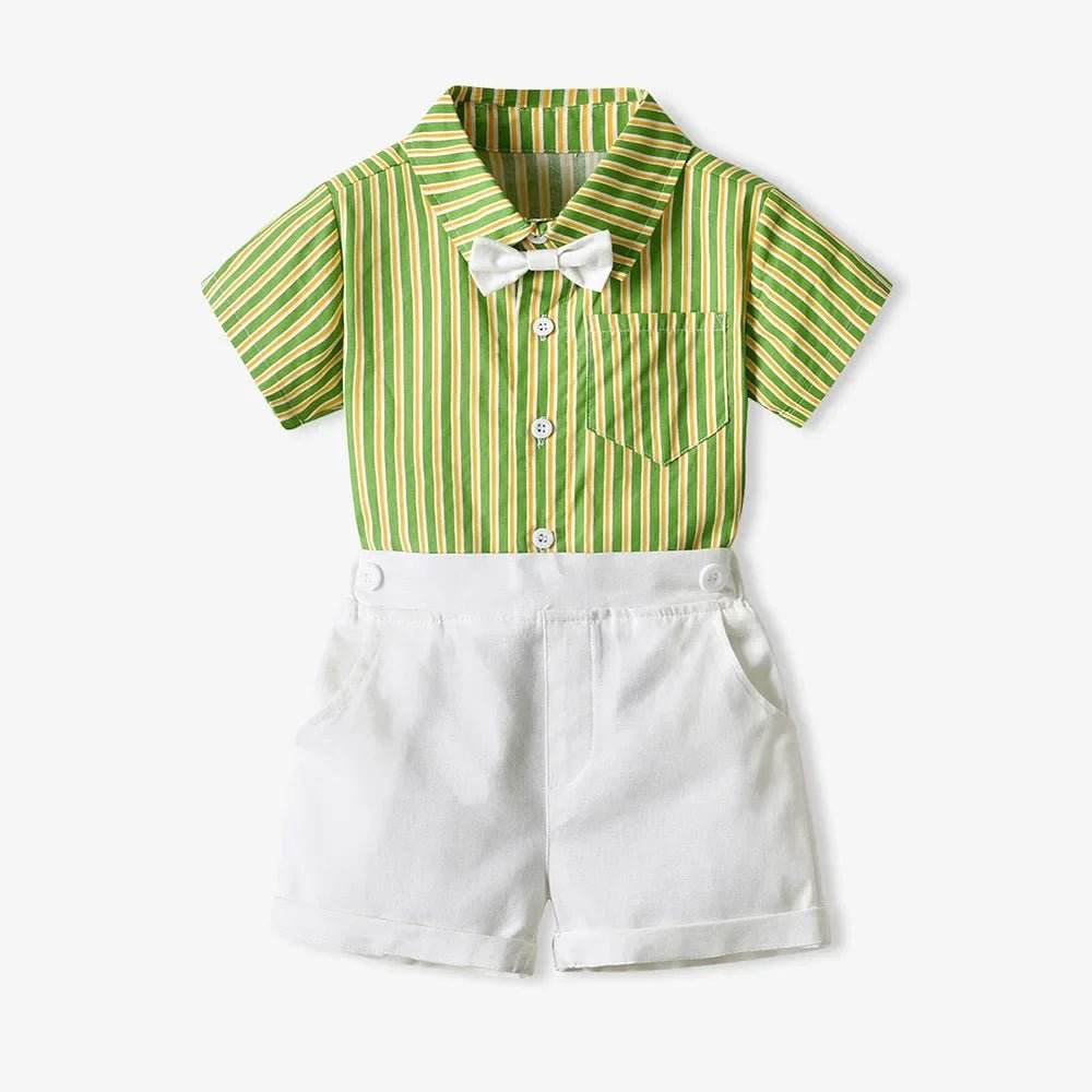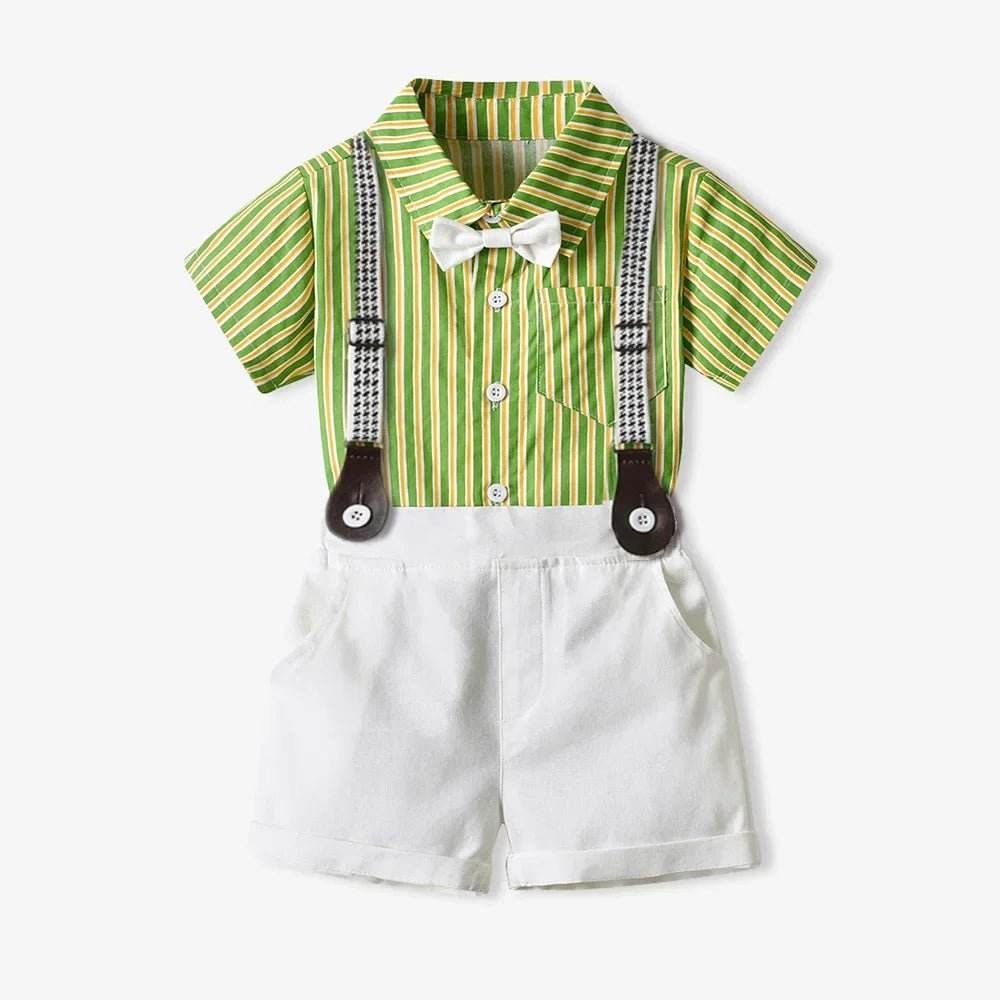 This adorable outfit includes a striped shirt paired with matching shorts, complete with optional suspenders for added flair. The stripes add a touch of classic charm, while the tailored fit ensures your baby boy looks dapper and ready for any event.