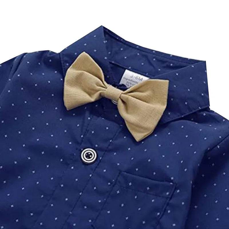The set includes a smart navy blue shirt adorned with tiny polka dots, paired with a cute bow tie for that extra touch of charm. The matching suspenders and beige pants complete the look, making it perfect for weddings, family gatherings, or any special event.