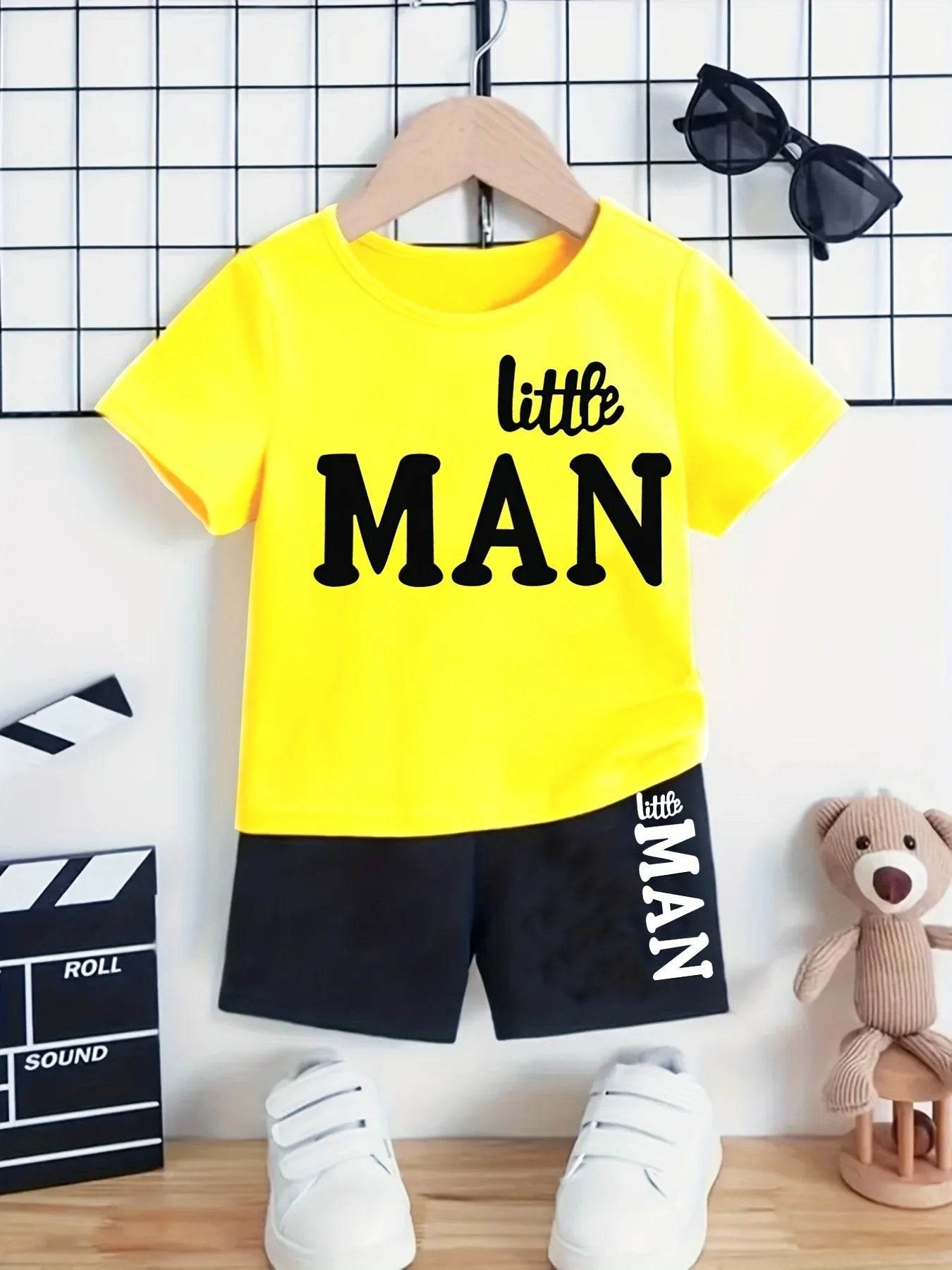 The images showcase the tracksuits in both black and yellow, highlighting the bold "Little Man" graphic that adds a playful touch. Paired with sneakers or sandals, these outfits are sure to make your little one the center of attention.