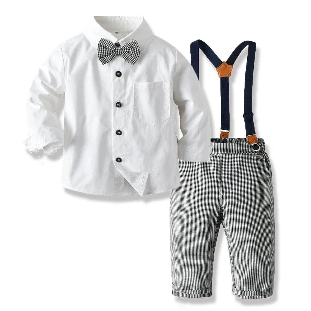 The images showcase the outfit's delightful design, featuring a plaid or striped top with a matching bow tie, and pants with adjustable suspenders. These elements combine to create a polished, gentlemanly look that’s both adorable and practical.