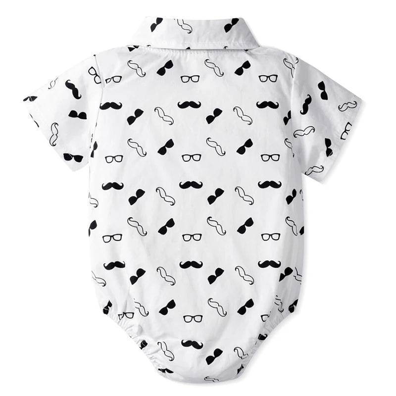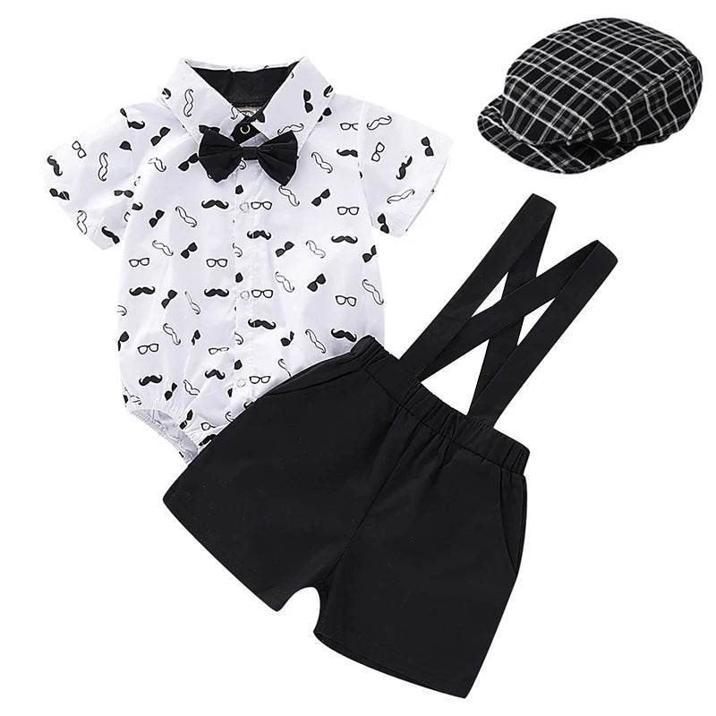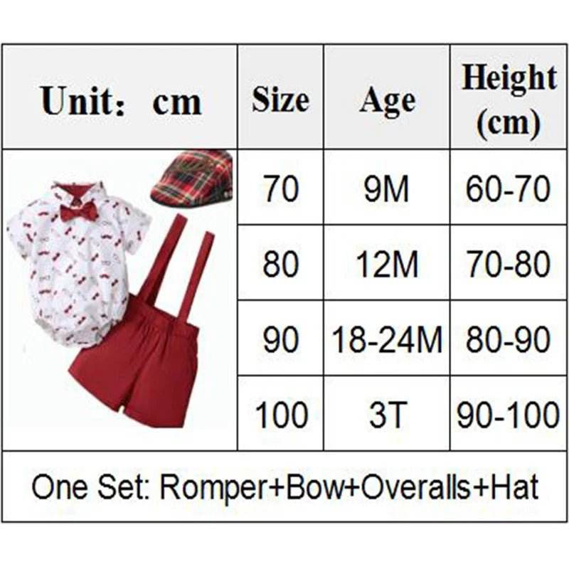 Crafted from soft combed cotton, this outfit ensures a gentle touch against your baby's delicate skin. The set includes a charming romper with playful patterns, stylish overalls, a dapper bow tie, and a cute hat to complete the look. Available in vibrant colors like Black, Green, Khaki, and Red, you can choose the perfect shade to match the occasion.
