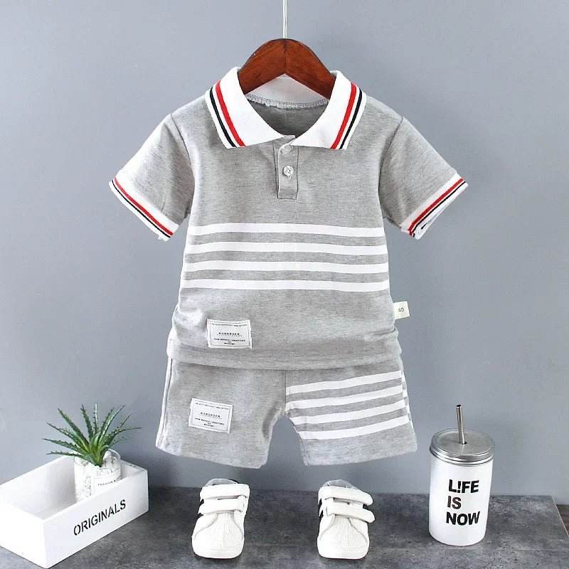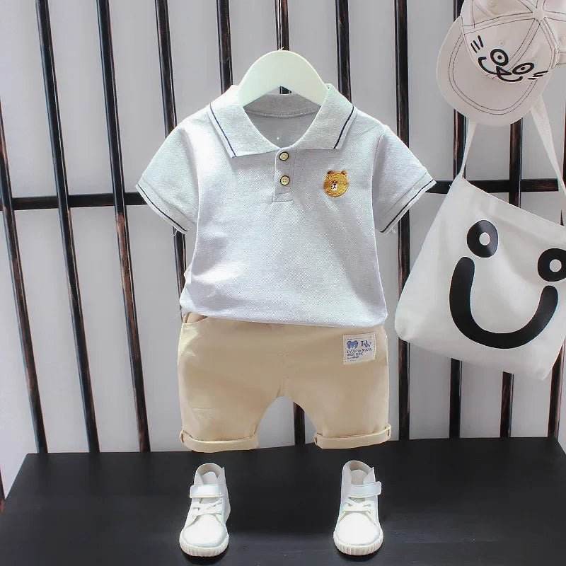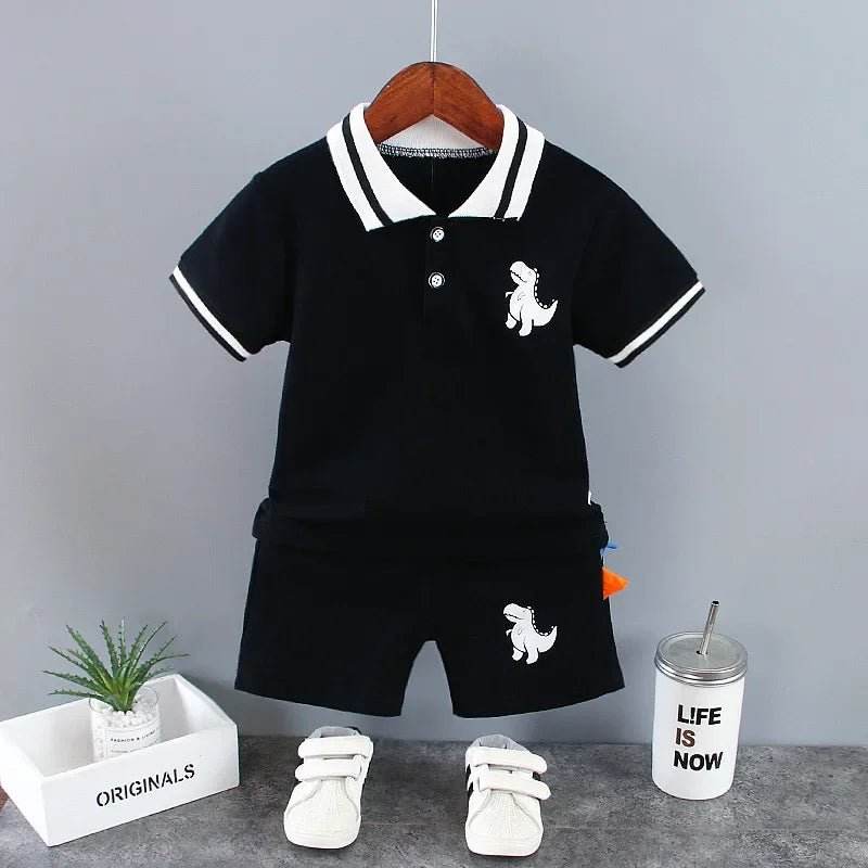 The playful dinosaur design adds a fun touch, making your baby boy look both adorable and stylish. The set includes a charming polo shirt with a cute dinosaur print and matching shorts, perfect for any casual outing or playdate.