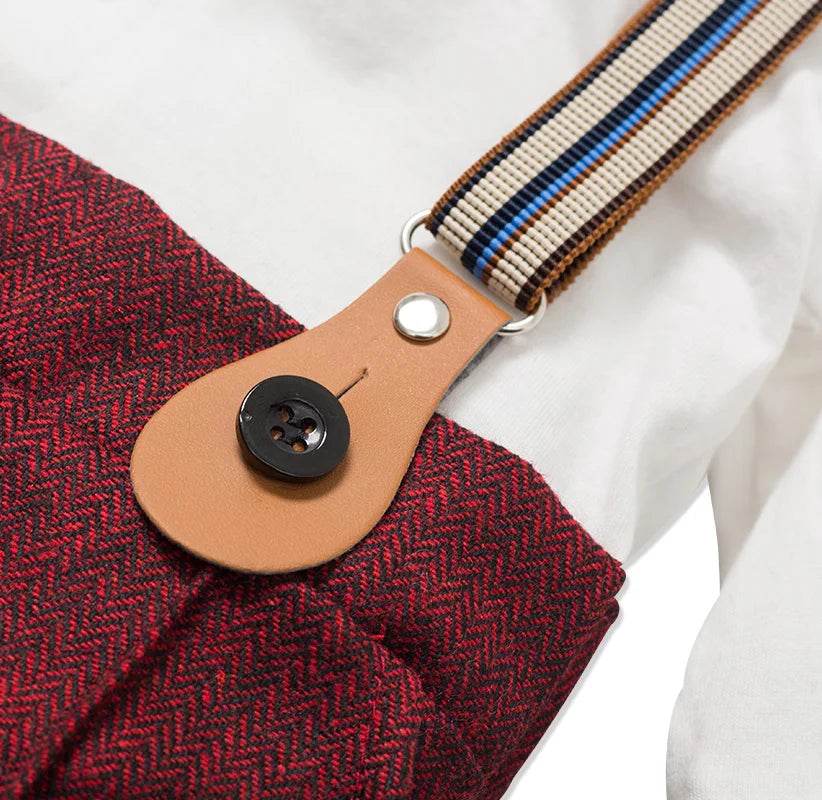 This set includes a crisp white shirt, a smart bow tie, and a pair of stylish suspenders. The matching vest and pants come in a choice of sophisticated colors: Navy, Grey, Red, and Khaki. The ensemble is completed with an adorable cap, adding a touch of charm to your little one's outfit.