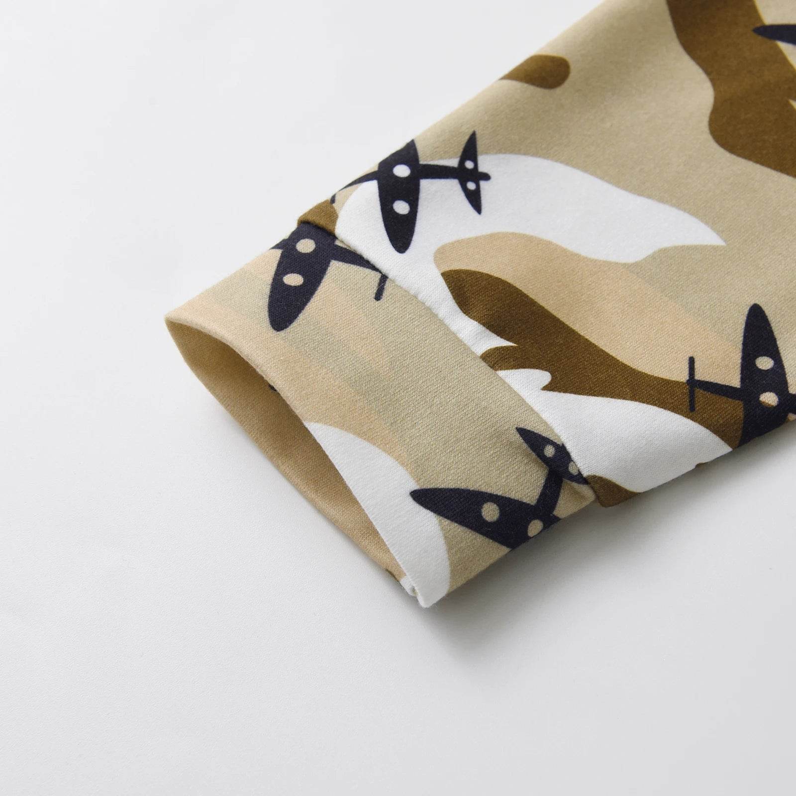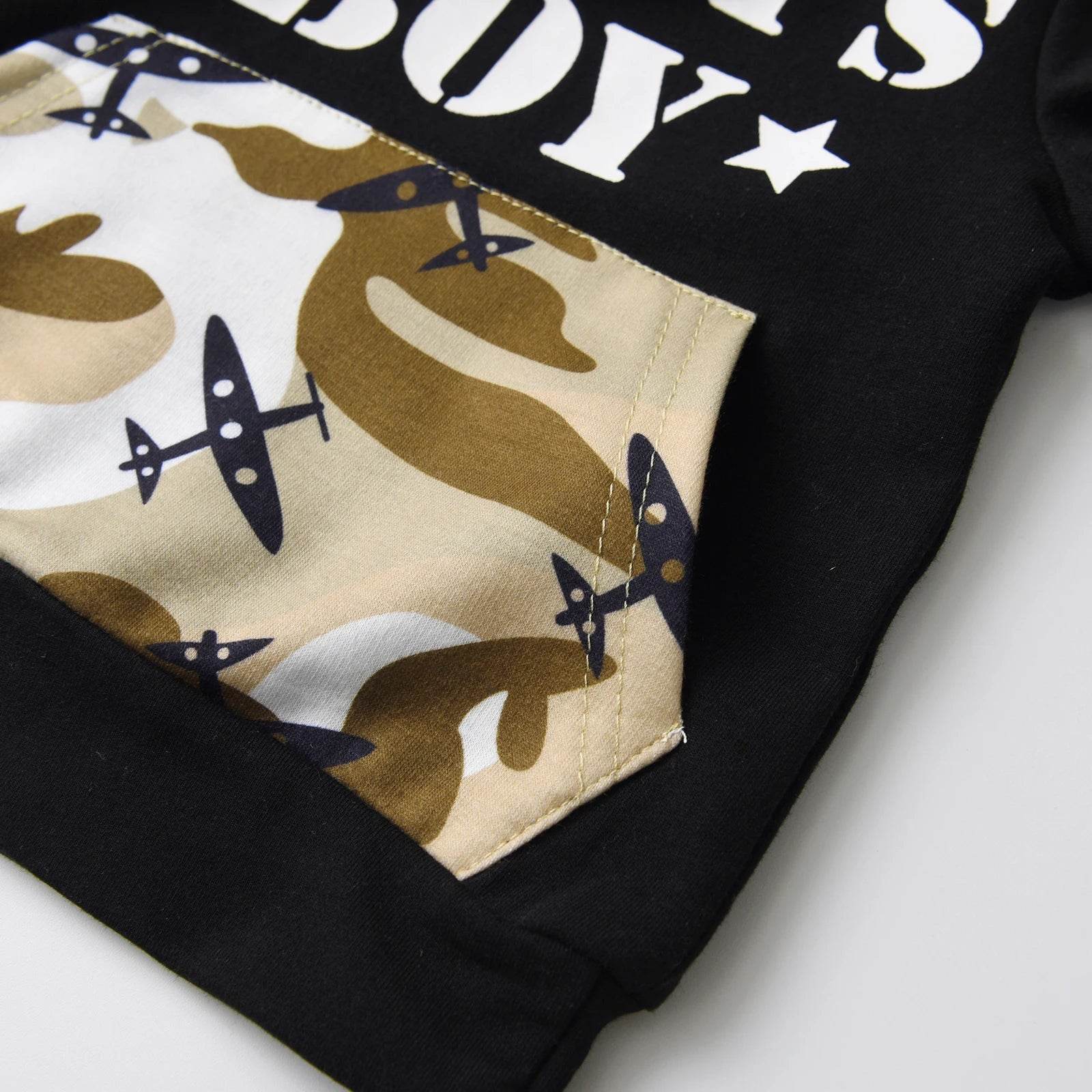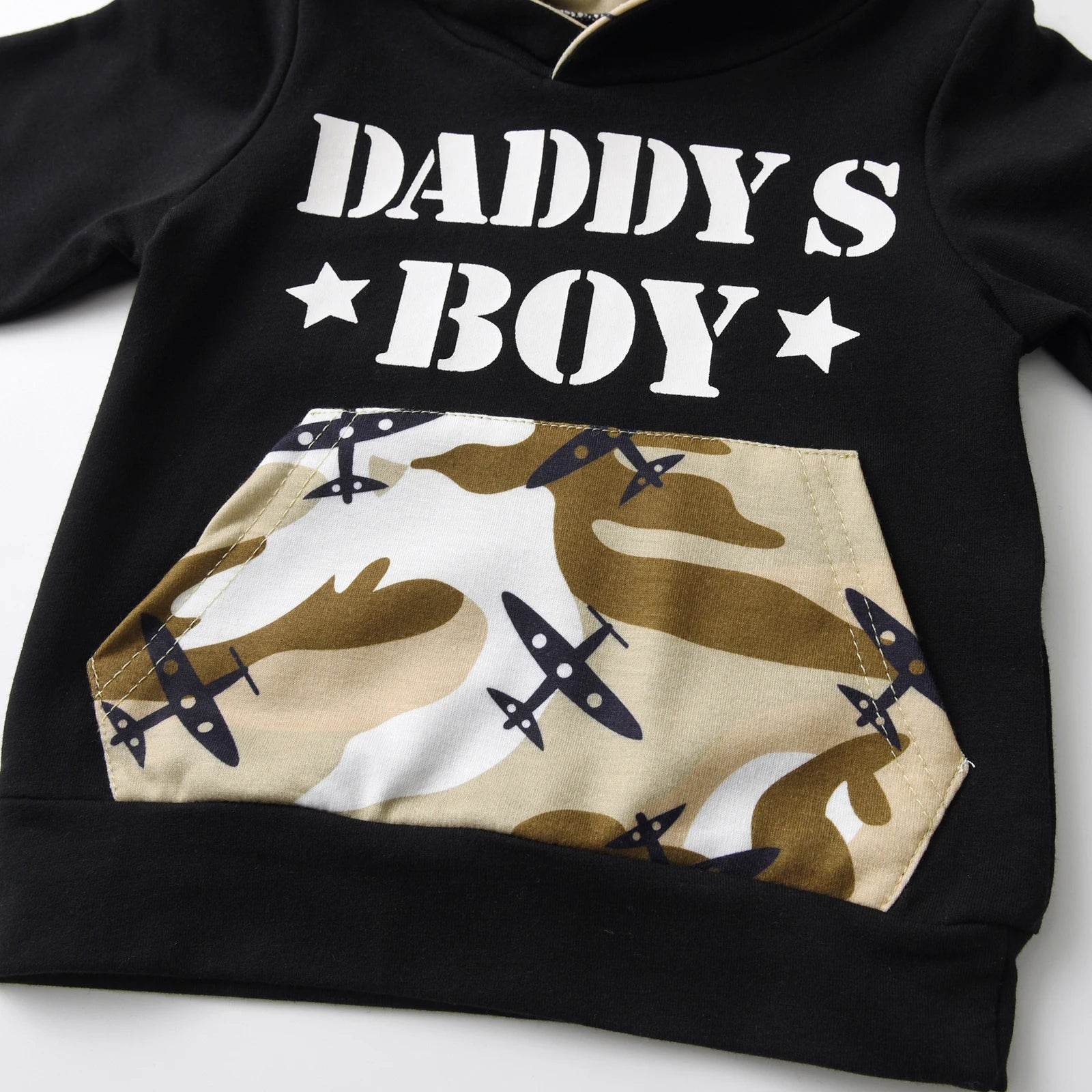 The outfit features a playful "Daddy's Boy" hoodie paired with camo-patterned pants, making it a fun and fashionable choice for any occasion. The hoodie’s soft fabric and the pants’ elastic waistband ensure a snug and cozy fit, allowing your child to move freely and comfortably.