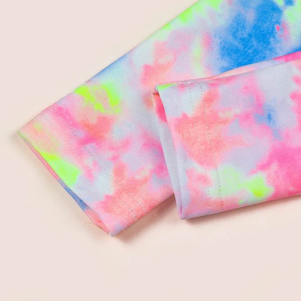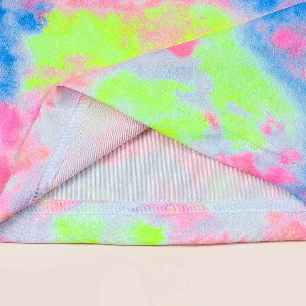 The swimwear features a delightful mix of pink, blue, and neon hues, creating a playful tie-dye pattern that captures the essence of summer fun. The set includes a long-sleeve top and matching bottoms, perfect for mixing and matching with other summer essentials.
