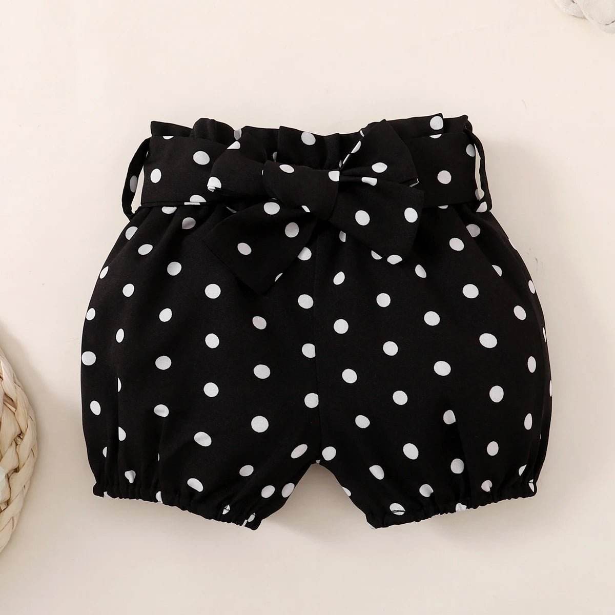 Crafted with comfort in mind, this outfit ensures your baby feels cozy all day long. The soft fabric is gentle on delicate skin, making it ideal for babies aged 0-18 months. The set includes a cute top with ruffled sleeves, matching polka dot shorts, and a sweet bow accessory, creating a complete look that’s both stylish and practical.