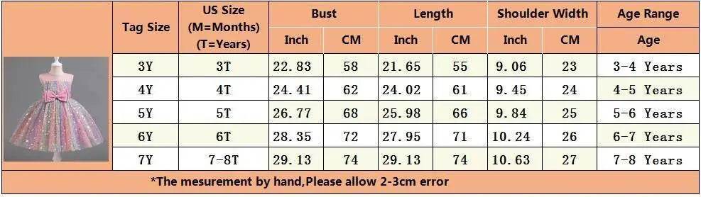 Designed for girls aged 3 to 8 years, this dress comes in sizes from 3T to 7-8T. Please refer to the size chart for accurate measurements to ensure the perfect fit for your little princess.