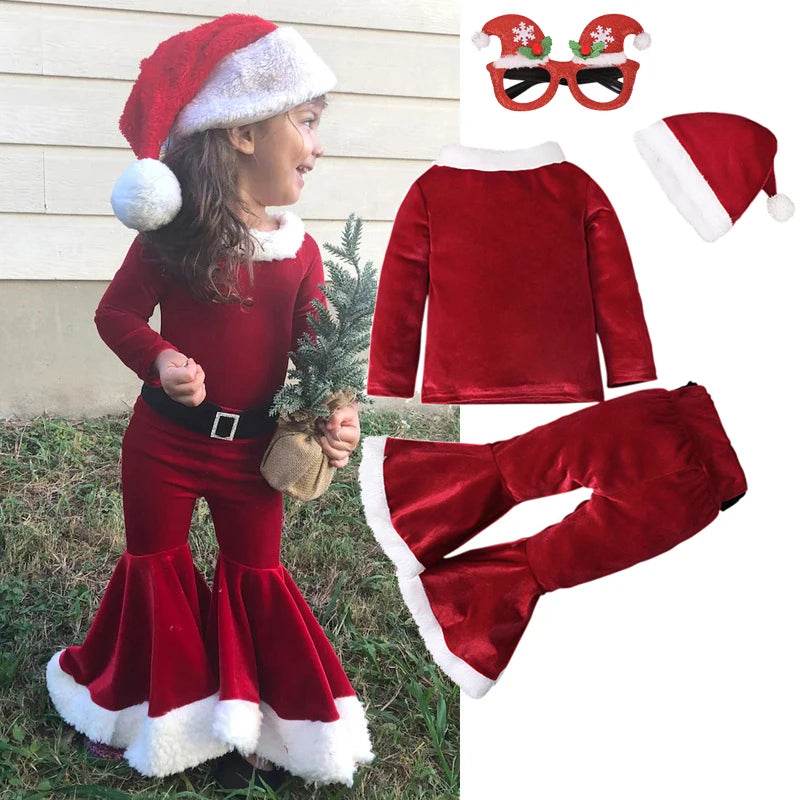 Whether it's a family gathering, a holiday party, or a fun photo session, this outfit is sure to make your little girl the star of the show. The set includes charming accessories like a hat and striped leggings, adding an extra touch of holiday magic.