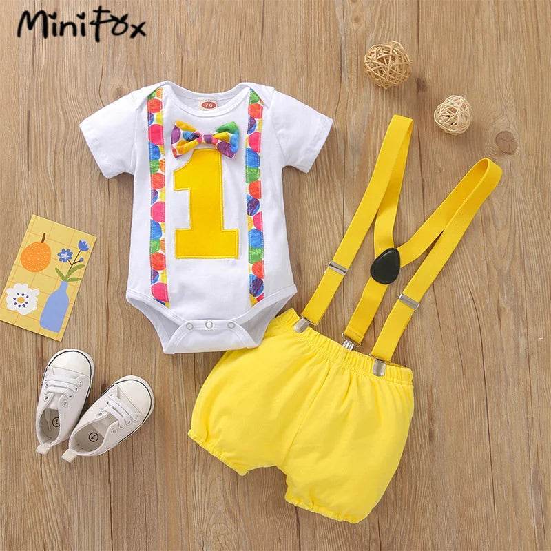 Make your baby boy's birthday unforgettable with the Baby Suspender Cake Smash Boy Birthday Clothing Set from Minifox. This charming ensemble is perfect for capturing those precious moments, whether it's a cake smash photo shoot or a lively birthday party. Crafted with high-quality materials, this outfit ensures comfort and durability, allowing your little one to move freely and enjoy the festivities.