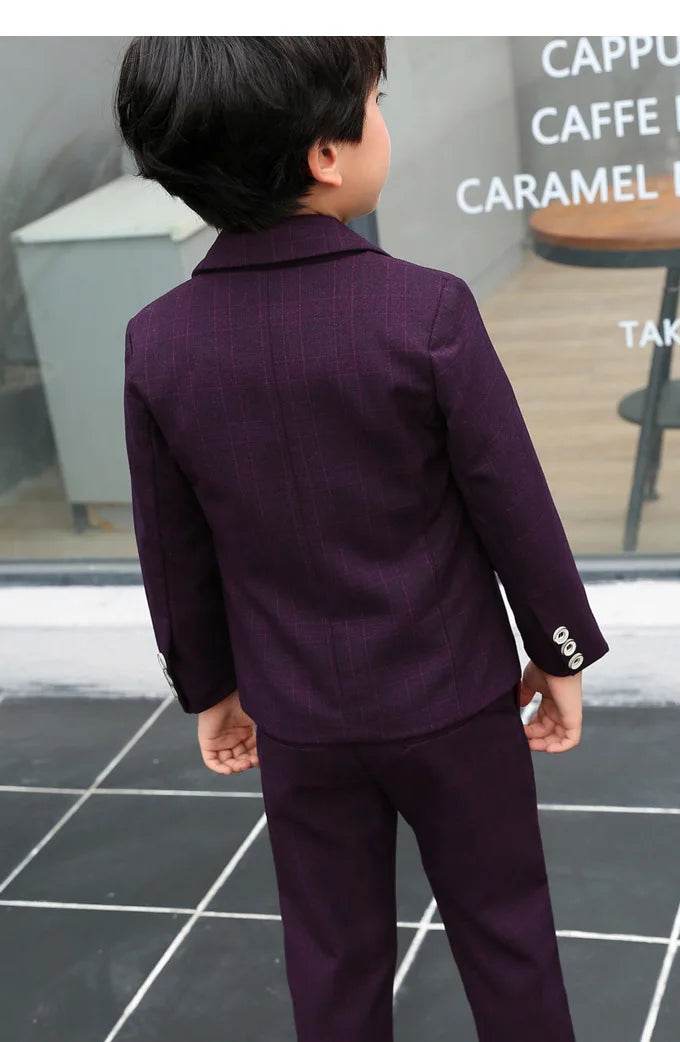Whether it's a wedding, birthday party, or family gathering, this outfit is designed to impress. The elegant combination of purple and black, along with a charming flower pattern, adds a touch of sophistication to your child's wardrobe. The set includes a jacket, vest, and pants, providing a complete look that’s both fashionable and functional.